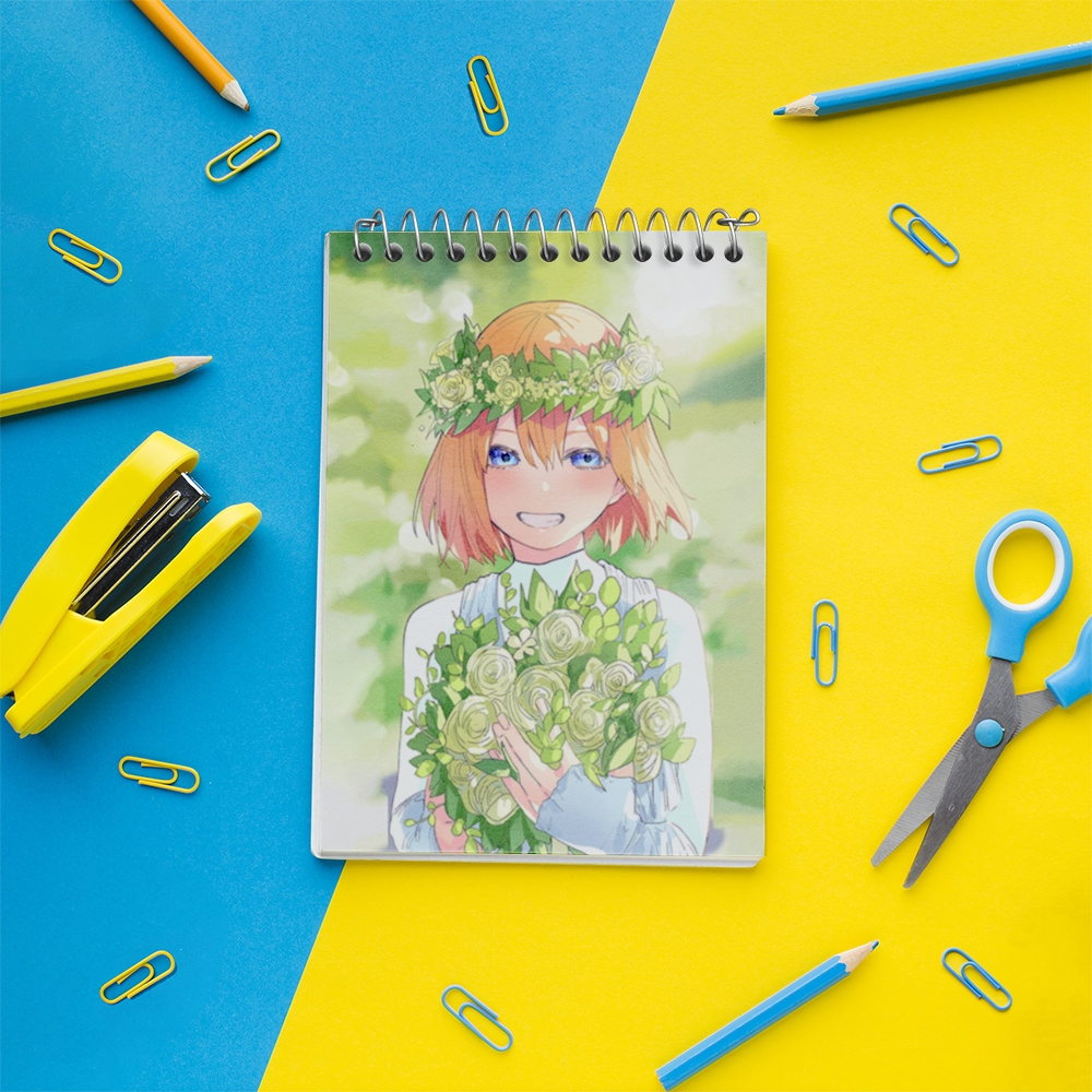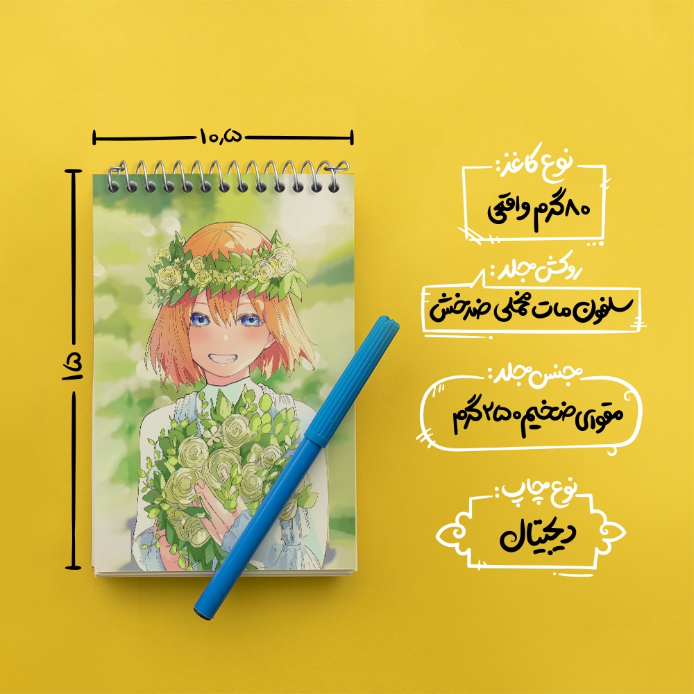 برند خندالو در زمینه تولید انواع دفاتر فانتزی و تحصیلی فعالیت میکند که به دلیل جذابیت ظاهری و طرح های متنوع طرفداران زیادی دارد. دفتر یادداشت خندالو طرح یوتسوبا انیمه پنج عروس مساوی محصولی مناسب برای همه عاشقان لوازم التحریر است و همچنین همه کسانی که بنا به موقعیت تحصیل یا شغلشان با دفتر و نوشت افزار زیاد سر و کار دارند. در تولید دفتر یادداشت خندالو طرح یوتسوبا انیمه پنج عروس مساوی از نوع صحافی فنر مارپیچ استفاده شده که در این نوع صحافی برگهها به راحتی چرخیده و یا بیرون آورده می شوند. دفتر های خندالو دارای جلد انعطاف پذیر از جنس مقوای گلاسه 250 گرم با روکش سلفون مات مخملی است که به شما امکان میدهد از دفتر خود بدون اینکه نگرانی از شکستن یا خراب شدن جلد را داشته باشید استفاده کنید و همچنین در این دفاتر از کاغذ 80 گرم با کیفیت استفاده شده که باعث میشود هنگام نوشتن به خوبی جوهر قلم بر روی صفحه نشسته و از خط خوردگیها جلوگیری کند. دفتر یادداشت خندالو با جنس و دوام مناسب، برگه های کاملاً سفید و خطوط طوسی دقیق را داراست که انسان را به نوشتن منظم و زیبا ترغیب میکند. طراحی کاملاً مناسب این دفاتر، به همراه کیفیت بالا، از آن یک محصول مورد علاقه و قابل اعتماد برای همه مقاطع تحصیلی میسازد. دفتر یادداشت خندالو طرح یوتسوبا انیمه پنج عروس مساوی انتخابی هوشمندانه و مناسب برای افرادی است که به دنبال دفتری با کیفیت و کاربرد عالی هستند. این دفتر، همراه خوبی برای شما در تمام مراحل تحصیل و کار خواهد بود و تجربهای لذتبخش از نوشتن و آموختن را به شما هدیه میدهد.