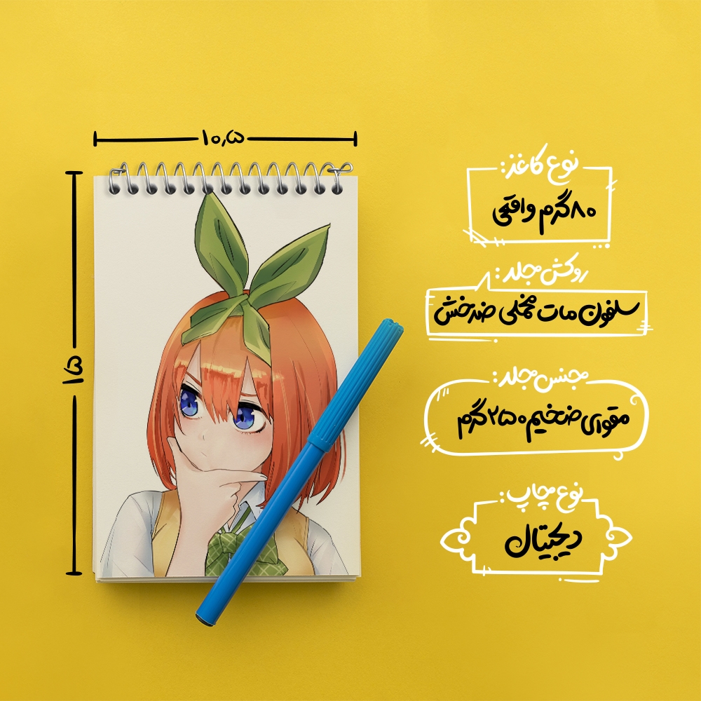 برند خندالو در زمینه تولید انواع دفاتر فانتزی و تحصیلی فعالیت میکند که به دلیل جذابیت ظاهری و طرح های متنوع طرفداران زیادی دارد. دفتر یادداشت خندالو طرح یوتسوبا انیمه پنج عروس مساوی محصولی مناسب برای همه عاشقان لوازم التحریر است و همچنین همه کسانی که بنا به موقعیت تحصیل یا شغلشان با دفتر و نوشت افزار زیاد سر و کار دارند. در تولید دفتر یادداشت خندالو طرح یوتسوبا انیمه پنج عروس مساوی از نوع صحافی فنر مارپیچ استفاده شده که در این نوع صحافی برگهها به راحتی چرخیده و یا بیرون آورده می شوند. دفتر های خندالو دارای جلد انعطاف پذیر از جنس مقوای گلاسه 250 گرم با روکش سلفون مات مخملی است که به شما امکان میدهد از دفتر خود بدون اینکه نگرانی از شکستن یا خراب شدن جلد را داشته باشید استفاده کنید و همچنین در این دفاتر از کاغذ 80 گرم با کیفیت استفاده شده که باعث میشود هنگام نوشتن به خوبی جوهر قلم بر روی صفحه نشسته و از خط خوردگیها جلوگیری کند. دفتر یادداشت خندالو با جنس و دوام مناسب، برگه های کاملاً سفید و خطوط طوسی دقیق را داراست که انسان را به نوشتن منظم و زیبا ترغیب میکند. طراحی کاملاً مناسب این دفاتر، به همراه کیفیت بالا، از آن یک محصول مورد علاقه و قابل اعتماد برای همه مقاطع تحصیلی میسازد. دفتر یادداشت خندالو طرح یوتسوبا انیمه پنج عروس مساوی انتخابی هوشمندانه و مناسب برای افرادی است که به دنبال دفتری با کیفیت و کاربرد عالی هستند. این دفتر، همراه خوبی برای شما در تمام مراحل تحصیل و کار خواهد بود و تجربهای لذتبخش از نوشتن و آموختن را به شما هدیه میدهد.