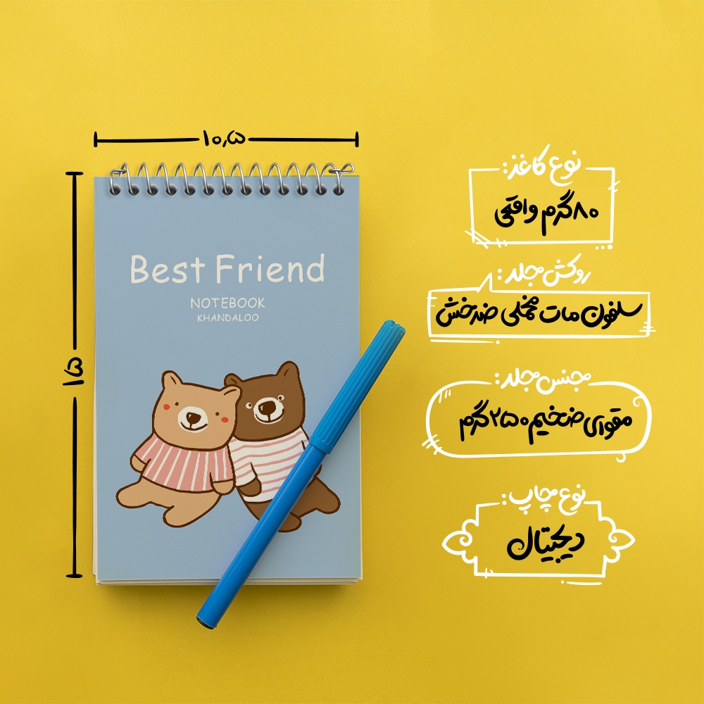 برند خندالو در زمینه تولید انواع دفاتر فانتزی و تحصیلی فعالیت میکند که به دلیل جذابیت ظاهری و طرح های متنوع طرفداران زیادی دارد. دفتر یادداشت خندالو طرح Best Friends محصولی مناسب برای همه عاشقان لوازم التحریر است و همچنین همه کسانی که بنا به موقعیت تحصیل یا شغلشان با دفتر و نوشت افزار زیاد سر و کار دارند. در تولید دفتر یادداشت خندالو طرح Best Friends از نوع صحافی فنر مارپیچ استفاده شده که در این نوع صحافی برگه‌ها به راحتی چرخیده و یا بیرون آورده می شوند.