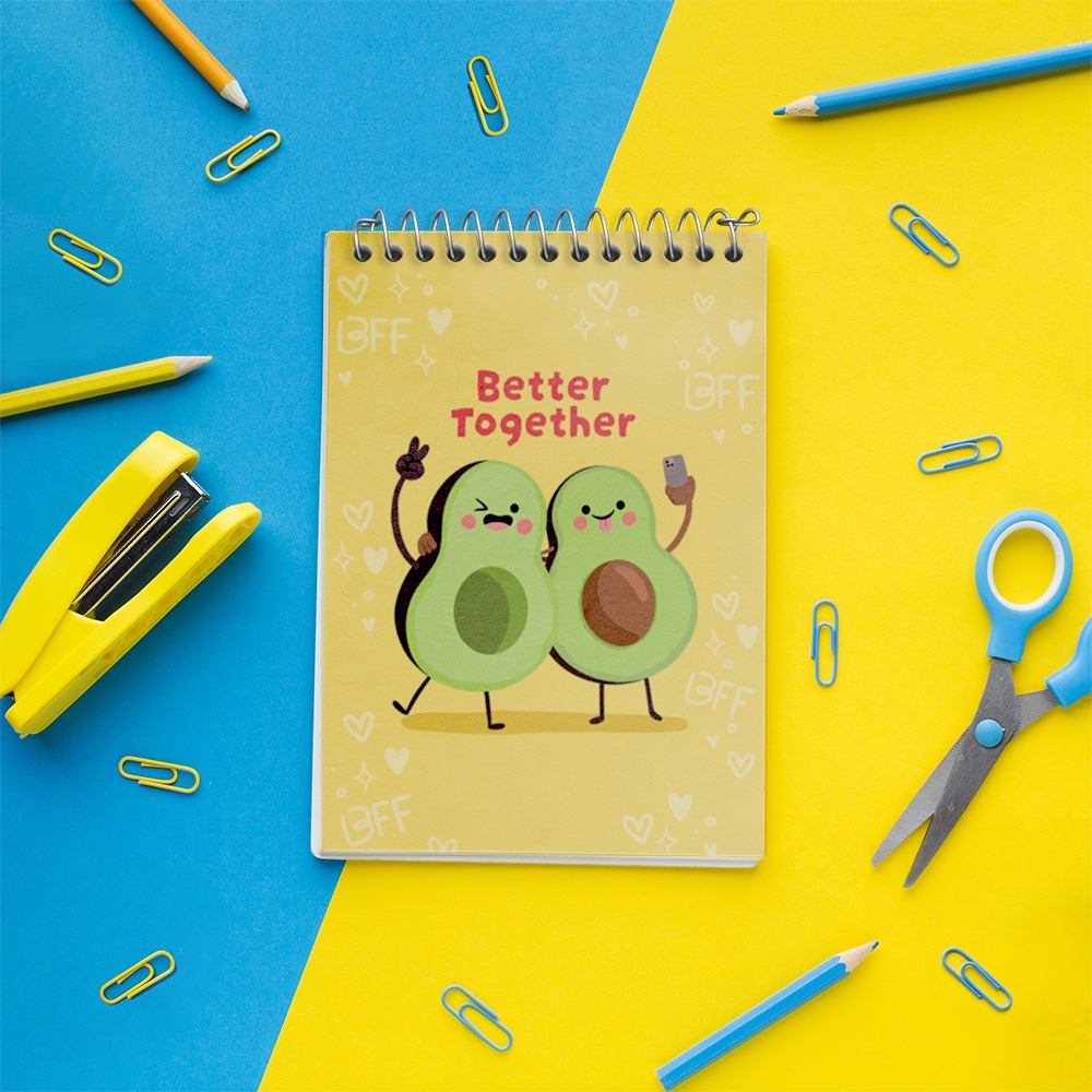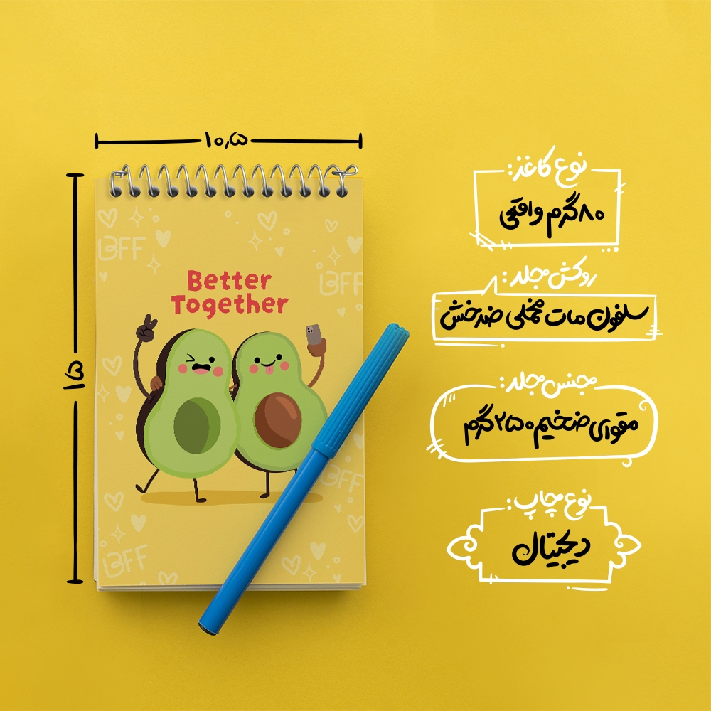 برند خندالو در زمینه تولید انواع دفاتر فانتزی و تحصیلی فعالیت میکند که به دلیل جذابیت ظاهری و طرح های متنوع طرفداران زیادی دارد. دفتر یادداشت خندالو طرح Better Together محصولی مناسب برای همه عاشقان لوازم التحریر است و همچنین همه کسانی که بنا به موقعیت تحصیل یا شغلشان با دفتر و نوشت افزار زیاد سر و کار دارند. در تولید دفتر یادداشت خندالو طرح Better Together از نوع صحافی فنر مارپیچ استفاده شده که در این نوع صحافی برگه‌ها به راحتی چرخیده و یا بیرون آورده می شوند.
