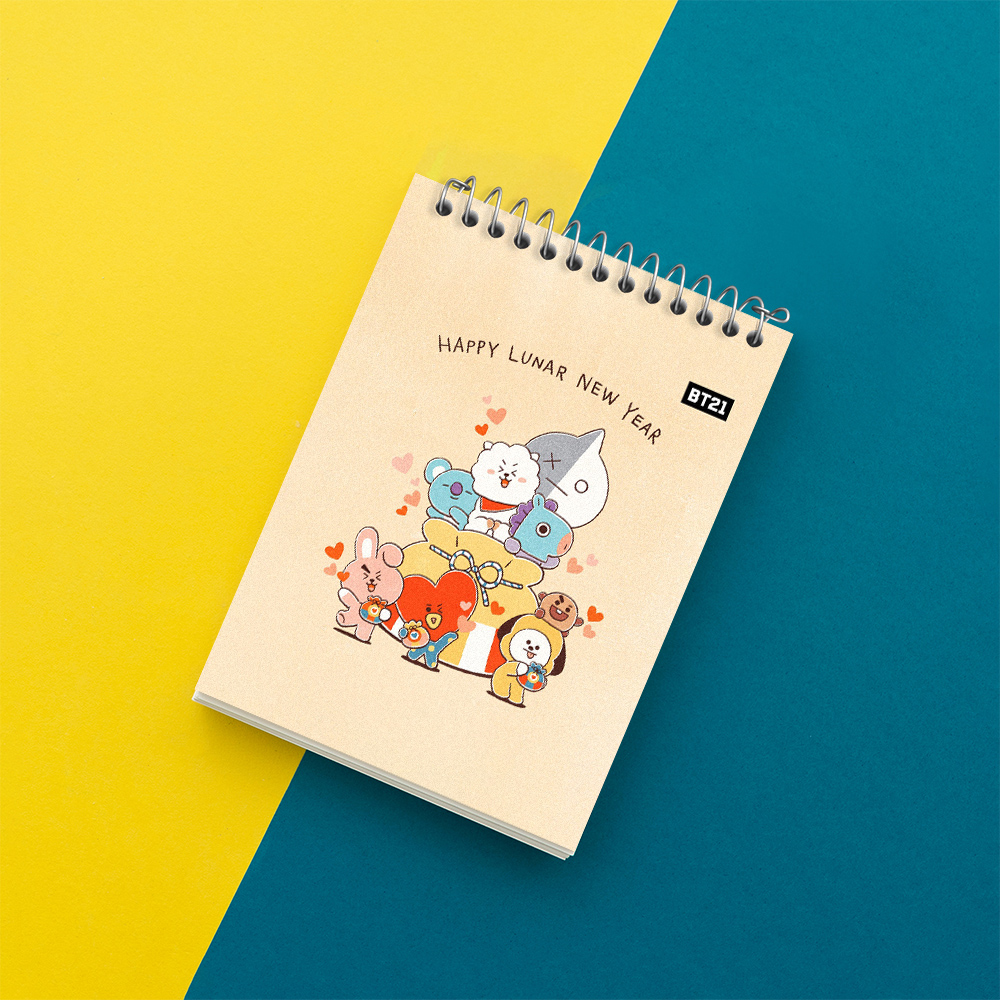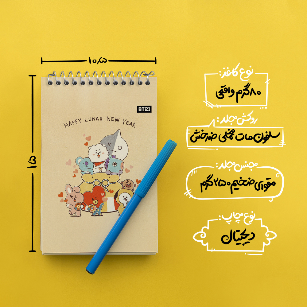 برند خندالو در زمینه تولید انواع دفاتر فانتزی و تحصیلی فعالیت میکند که به دلیل جذابیت ظاهری و طرح های متنوع طرفداران زیادی دارد. دفتر یادداشت خندالو طرح BT21 محصولی مناسب برای همه عاشقان لوازم التحریر است و همچنین همه کسانی که بنا به موقعیت تحصیل یا شغلشان با دفتر و نوشت افزار زیاد سر و کار دارند. در تولید دفتر یادداشت خندالو طرح BT21 از نوع صحافی فنر مارپیچ استفاده شده که در این نوع صحافی برگه‌ها به راحتی چرخیده و یا بیرون آورده می شوند.