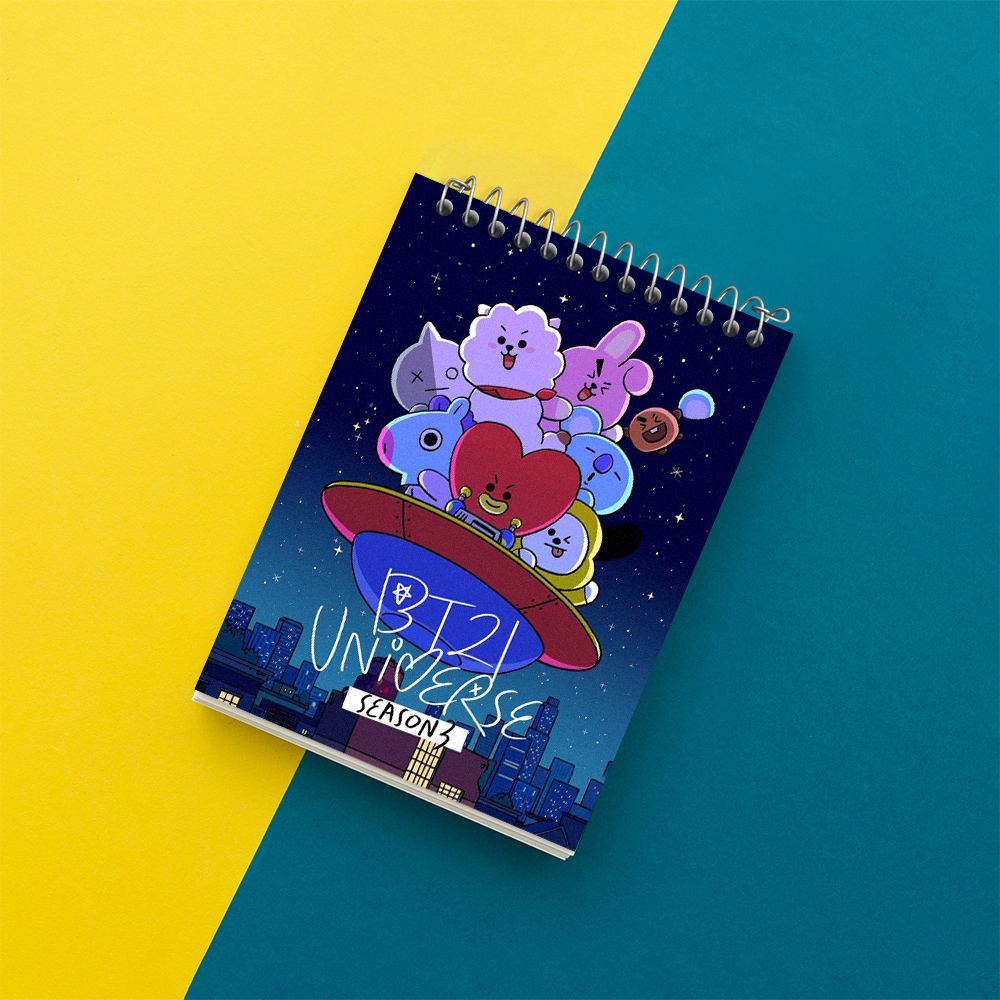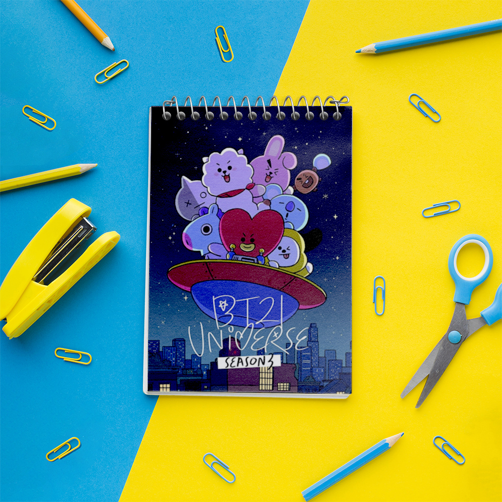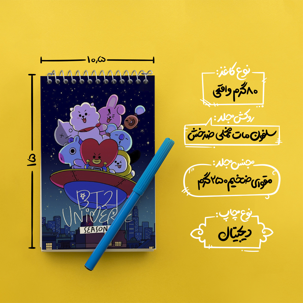برند خندالو در زمینه تولید انواع دفاتر فانتزی و تحصیلی فعالیت میکند که به دلیل جذابیت ظاهری و طرح های متنوع طرفداران زیادی دارد. دفتر یادداشت خندالو طرح BT21 محصولی مناسب برای همه عاشقان لوازم التحریر است و همچنین همه کسانی که بنا به موقعیت تحصیل یا شغلشان با دفتر و نوشت افزار زیاد سر و کار دارند. در تولید دفتر یادداشت خندالو طرح BT21 از نوع صحافی فنر مارپیچ استفاده شده که در این نوع صحافی برگه‌ها به راحتی چرخیده و یا بیرون آورده می شوند.