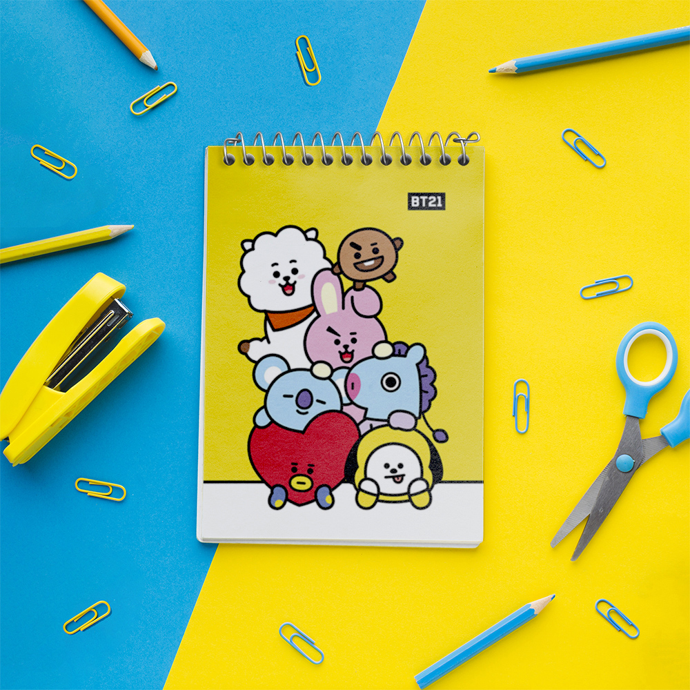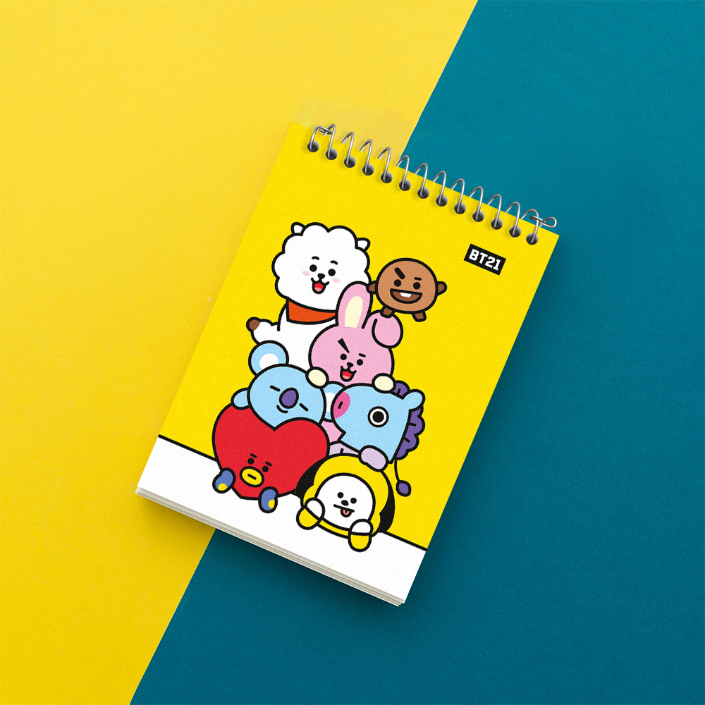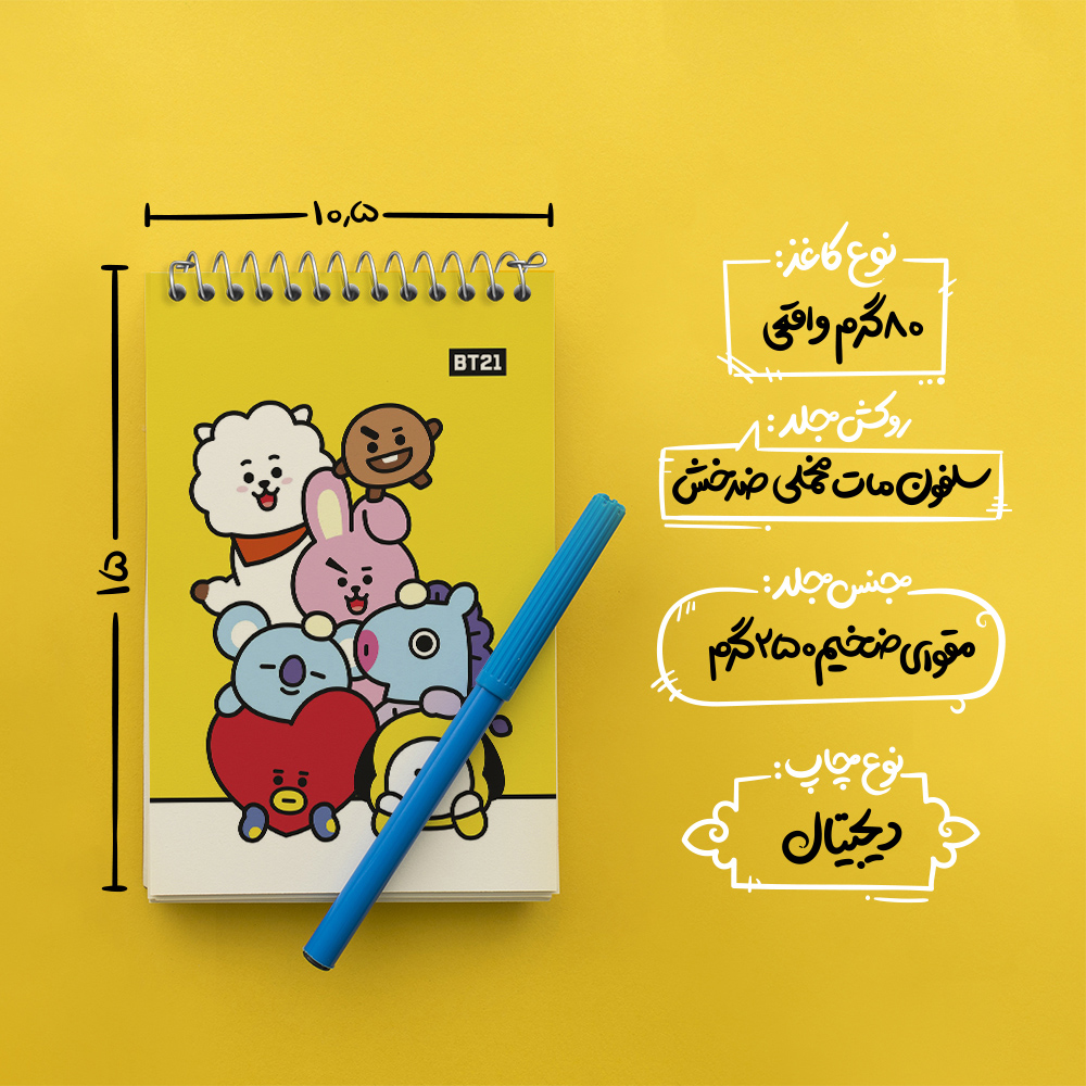 برند خندالو در زمینه تولید انواع دفاتر فانتزی و تحصیلی فعالیت میکند که به دلیل جذابیت ظاهری و طرح های متنوع طرفداران زیادی دارد. دفتر یادداشت خندالو طرح BT21 محصولی مناسب برای همه عاشقان لوازم التحریر است و همچنین همه کسانی که بنا به موقعیت تحصیل یا شغلشان با دفتر و نوشت افزار زیاد سر و کار دارند. در تولید دفتر یادداشت خندالو طرح BT21 از نوع صحافی فنر مارپیچ استفاده شده که در این نوع صحافی برگه‌ها به راحتی چرخیده و یا بیرون آورده می شوند.