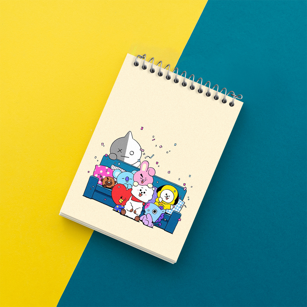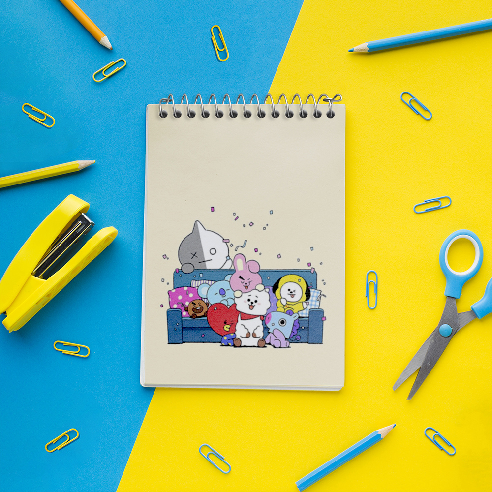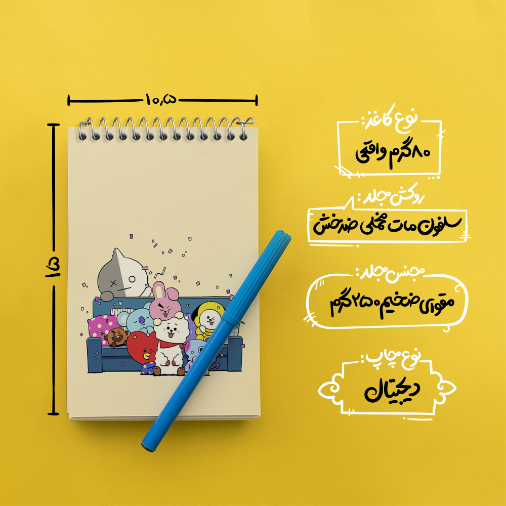 برند خندالو در زمینه تولید انواع دفاتر فانتزی و تحصیلی فعالیت میکند که به دلیل جذابیت ظاهری و طرح های متنوع طرفداران زیادی دارد. دفتر یادداشت خندالو طرح BT21 محصولی مناسب برای همه عاشقان لوازم التحریر است و همچنین همه کسانی که بنا به موقعیت تحصیل یا شغلشان با دفتر و نوشت افزار زیاد سر و کار دارند. در تولید دفتر یادداشت خندالو طرح BT21 از نوع صحافی فنر مارپیچ استفاده شده که در این نوع صحافی برگه‌ها به راحتی چرخیده و یا بیرون آورده می شوند.