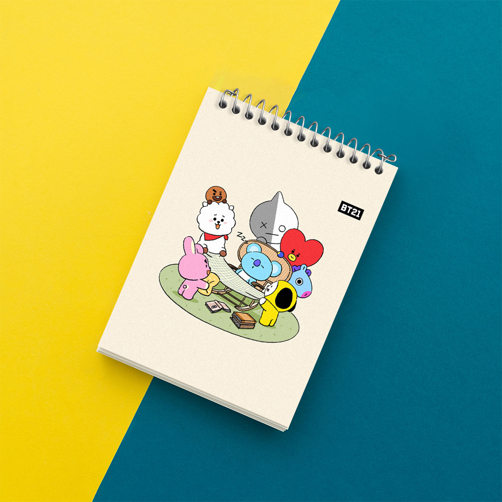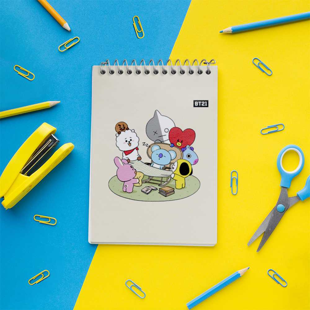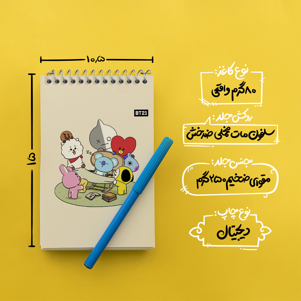 برند خندالو در زمینه تولید انواع دفاتر فانتزی و تحصیلی فعالیت میکند که به دلیل جذابیت ظاهری و طرح های متنوع طرفداران زیادی دارد. دفتر یادداشت خندالو طرح BT21 محصولی مناسب برای همه عاشقان لوازم التحریر است و همچنین همه کسانی که بنا به موقعیت تحصیل یا شغلشان با دفتر و نوشت افزار زیاد سر و کار دارند. در تولید دفتر یادداشت خندالو طرح BT21 از نوع صحافی فنر مارپیچ استفاده شده که در این نوع صحافی برگه‌ها به راحتی چرخیده و یا بیرون آورده می شوند.