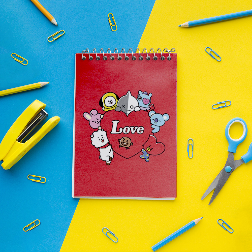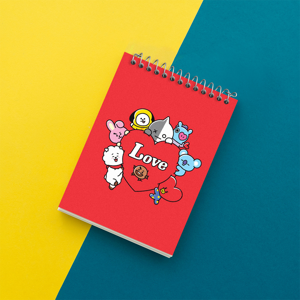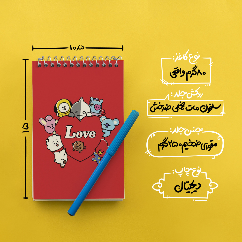 برند خندالو در زمینه تولید انواع دفاتر فانتزی و تحصیلی فعالیت میکند که به دلیل جذابیت ظاهری و طرح های متنوع طرفداران زیادی دارد. دفتر یادداشت خندالو طرح BT21 محصولی مناسب برای همه عاشقان لوازم التحریر است و همچنین همه کسانی که بنا به موقعیت تحصیل یا شغلشان با دفتر و نوشت افزار زیاد سر و کار دارند. در تولید دفتر یادداشت خندالو طرح BT21 از نوع صحافی فنر مارپیچ استفاده شده که در این نوع صحافی برگه‌ها به راحتی چرخیده و یا بیرون آورده می شوند.