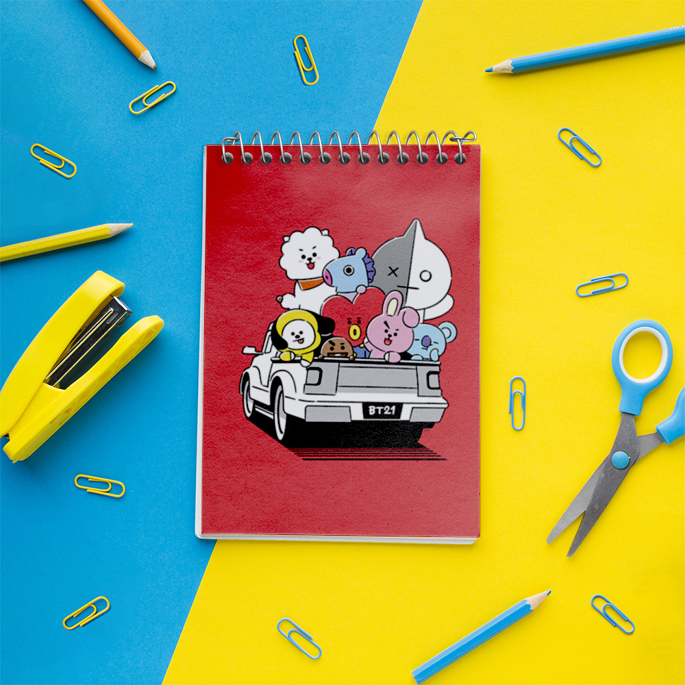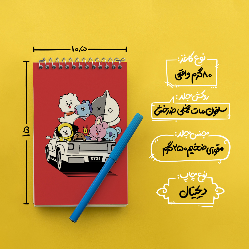 برند خندالو در زمینه تولید انواع دفاتر فانتزی و تحصیلی فعالیت میکند که به دلیل جذابیت ظاهری و طرح های متنوع طرفداران زیادی دارد. دفتر یادداشت خندالو طرح BT21 محصولی مناسب برای همه عاشقان لوازم التحریر است و همچنین همه کسانی که بنا به موقعیت تحصیل یا شغلشان با دفتر و نوشت افزار زیاد سر و کار دارند. در تولید دفتر یادداشت خندالو طرح BT21 از نوع صحافی فنر مارپیچ استفاده شده که در این نوع صحافی برگه‌ها به راحتی چرخیده و یا بیرون آورده می شوند.