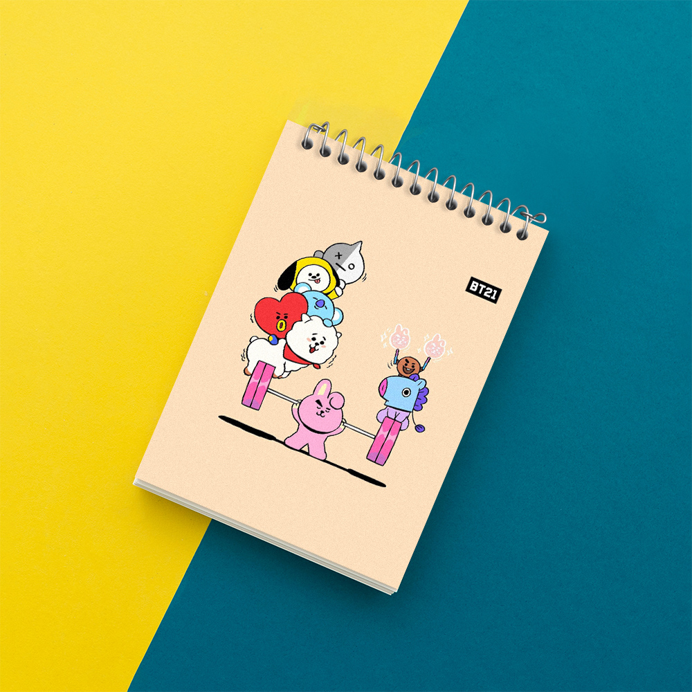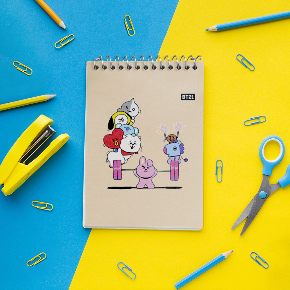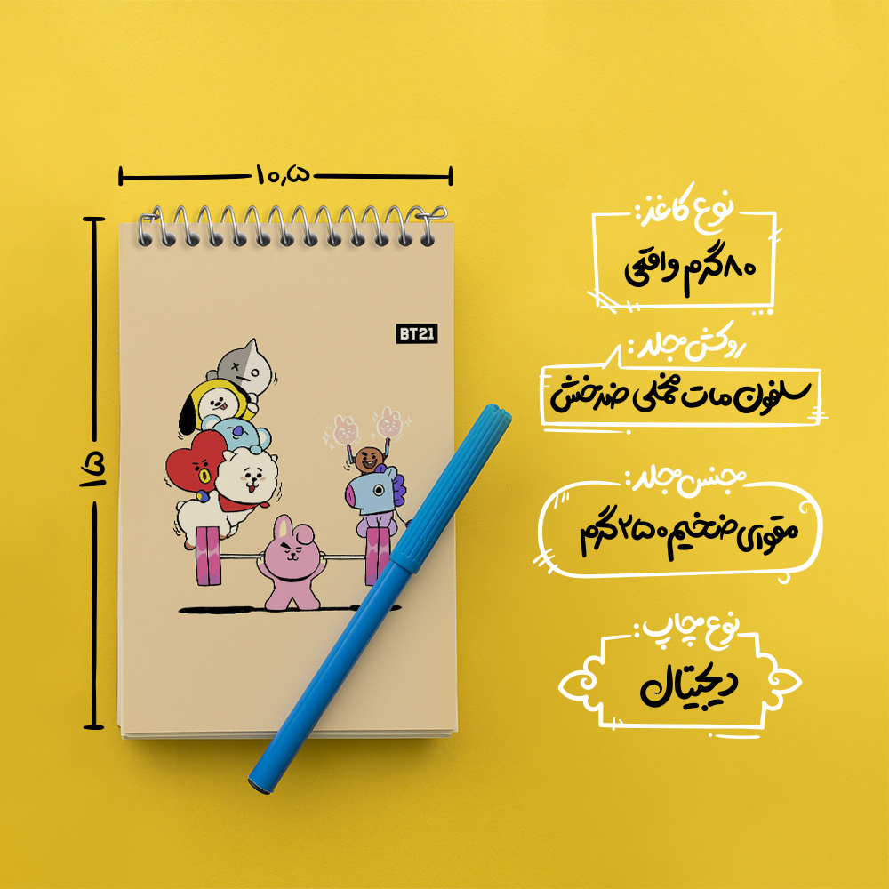 برند خندالو در زمینه تولید انواع دفاتر فانتزی و تحصیلی فعالیت میکند که به دلیل جذابیت ظاهری و طرح های متنوع طرفداران زیادی دارد. دفتر یادداشت خندالو طرح BT21 محصولی مناسب برای همه عاشقان لوازم التحریر است و همچنین همه کسانی که بنا به موقعیت تحصیل یا شغلشان با دفتر و نوشت افزار زیاد سر و کار دارند. در تولید دفتر یادداشت خندالو طرح BT21 از نوع صحافی فنر مارپیچ استفاده شده که در این نوع صحافی برگه‌ها به راحتی چرخیده و یا بیرون آورده می شوند.