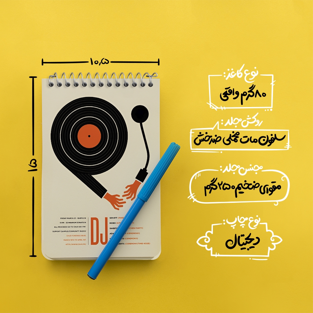برند خندالو در زمینه تولید انواع دفاتر فانتزی و تحصیلی فعالیت میکند که به دلیل جذابیت ظاهری و طرح های متنوع طرفداران زیادی دارد. دفتر یادداشت خندالو طرح DJ محصولی مناسب برای همه عاشقان لوازم التحریر است و همچنین همه کسانی که بنا به موقعیت تحصیل یا شغلشان با دفتر و نوشت افزار زیاد سر و کار دارند. در تولید دفتر یادداشت خندالو طرح DJ از نوع صحافی فنر مارپیچ استفاده شده که در این نوع صحافی برگه‌ها به راحتی چرخیده و یا بیرون آورده می شوند.