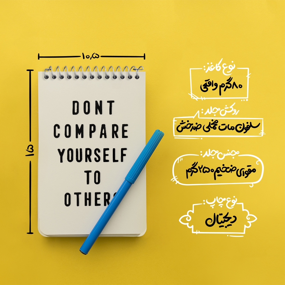 برند خندالو در زمینه تولید انواع دفاتر فانتزی و تحصیلی فعالیت میکند که به دلیل جذابیت ظاهری و طرح های متنوع طرفداران زیادی دارد. دفتر یادداشت خندالو طرح Don’t Compare Yourself To Others محصولی مناسب برای همه عاشقان لوازم التحریر است و همچنین همه کسانی که بنا به موقعیت تحصیل یا شغلشان با دفتر و نوشت افزار زیاد سر و کار دارند. در تولید دفتر یادداشت خندالو طرح Don’t Compare Yourself To Others از نوع صحافی فنر مارپیچ استفاده شده که در این نوع صحافی برگه‌ها به راحتی چرخیده و یا بیرون آورده می شوند.