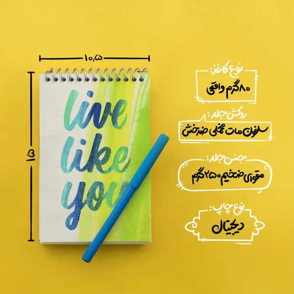 برند خندالو در زمینه تولید انواع دفاتر فانتزی و تحصیلی فعالیت میکند که به دلیل جذابیت ظاهری و طرح های متنوع طرفداران زیادی دارد. دفتر یادداشت خندالو طرح Live Like You محصولی مناسب برای همه عاشقان لوازم التحریر است و همچنین همه کسانی که بنا به موقعیت تحصیل یا شغلشان با دفتر و نوشت افزار زیاد سر و کار دارند. در تولید دفتر یادداشت خندالو طرح Live Like You از نوع صحافی فنر مارپیچ استفاده شده که در این نوع صحافی برگهها به راحتی چرخیده و یا بیرون آورده می شوند. دفتر های خندالو دارای جلد انعطاف پذیر از جنس مقوای گلاسه 250 گرم با روکش سلفون مات مخملی است که به شما امکان میدهد از دفتر خود بدون اینکه نگرانی از شکستن یا خراب شدن جلد را داشته باشید استفاده کنید و همچنین در این دفاتر از کاغذ 80 گرم با کیفیت استفاده شده که باعث میشود هنگام نوشتن به خوبی جوهر قلم بر روی صفحه نشسته و از خط خوردگیها جلوگیری کند. دفتر یادداشت خندالو با جنس و دوام مناسب، برگه های کاملاً سفید و خطوط طوسی دقیق را داراست که انسان را به نوشتن منظم و زیبا ترغیب میکند. طراحی کاملاً مناسب این دفاتر، به همراه کیفیت بالا، از آن یک محصول مورد علاقه و قابل اعتماد برای همه مقاطع تحصیلی میسازد. دفتر یادداشت خندالو طرح Live Like You انتخابی هوشمندانه و مناسب برای افرادی است که به دنبال دفتری با کیفیت و کاربرد عالی هستند. این دفتر، همراه خوبی برای شما در تمام مراحل تحصیل و کار خواهد بود و تجربهای لذتبخش از نوشتن و آموختن را به شما هدیه میدهد.
