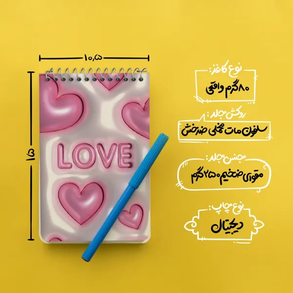 برند خندالو در زمینه تولید انواع دفاتر فانتزی و تحصیلی فعالیت میکند که به دلیل جذابیت ظاهری و طرح های متنوع طرفداران زیادی دارد. دفتر یادداشت خندالو طرح Love محصولی مناسب برای همه عاشقان لوازم التحریر است و همچنین همه کسانی که بنا به موقعیت تحصیل یا شغلشان با دفتر و نوشت افزار زیاد سر و کار دارند. در تولید دفتر یادداشت خندالو طرح Love از نوع صحافی فنر مارپیچ استفاده شده که در این نوع صحافی برگه‌ها به راحتی چرخیده و یا بیرون آورده می شوند.