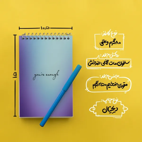 برند خندالو در زمینه تولید انواع دفاتر فانتزی و تحصیلی فعالیت میکند که به دلیل جذابیت ظاهری و طرح های متنوع طرفداران زیادی دارد. دفتر یادداشت خندالو طرح You ‘re Enough محصولی مناسب برای همه عاشقان لوازم التحریر است و همچنین همه کسانی که بنا به موقعیت تحصیل یا شغلشان با دفتر و نوشت افزار زیاد سر و کار دارند. در تولید دفتر یادداشت خندالو طرح You ‘re Enough از نوع صحافی فنر مارپیچ استفاده شده که در این نوع صحافی برگهها به راحتی چرخیده و یا بیرون آورده می شوند. دفتر های خندالو دارای جلد انعطاف پذیر از جنس مقوای گلاسه 250 گرم با روکش سلفون مات مخملی است که به شما امکان میدهد از دفتر خود بدون اینکه نگرانی از شکستن یا خراب شدن جلد را داشته باشید استفاده کنید و همچنین در این دفاتر از کاغذ 80 گرم با کیفیت استفاده شده که باعث میشود هنگام نوشتن به خوبی جوهر قلم بر روی صفحه نشسته و از خط خوردگیها جلوگیری کند. دفتر یادداشت خندالو با جنس و دوام مناسب، برگه های کاملاً سفید و خطوط طوسی دقیق را داراست که انسان را به نوشتن منظم و زیبا ترغیب میکند. طراحی کاملاً مناسب این دفاتر، به همراه کیفیت بالا، از آن یک محصول مورد علاقه و قابل اعتماد برای همه مقاطع تحصیلی میسازد. دفتر یادداشت خندالو طرح You ‘re Enough انتخابی هوشمندانه و مناسب برای افرادی است که به دنبال دفتری با کیفیت و کاربرد عالی هستند. این دفتر، همراه خوبی برای شما در تمام مراحل تحصیل و کار خواهد بود و تجربهای لذتبخش از نوشتن و آموختن را به شما هدیه میدهد.