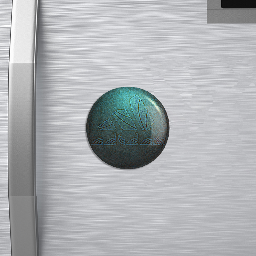مگنت آدیداس (Adidas) خندالو با روکش سلفون مات مخملی ضدخش و قطعه پشتی فلزی تولید شده است که آهنربای اتمی بکار برده شده در محصول، بصورت مخفی تعبیه شده ودیده نمی شود. ضمن اینکه گیرایی بسیار بالایی داشته و به هیچ عنوان از روی یخچال نمی افتد.