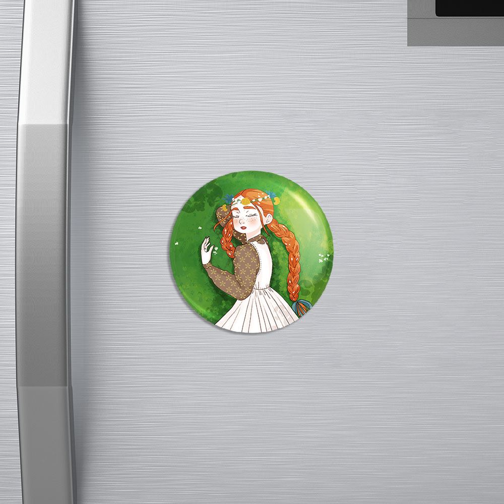 مگنت آن شرلی خندالو با روکش سلفون مات مخملی ضدخش و قطعه پشتی فلزی تولید شده است که آهنربای اتمی بکار برده شده در محصول، بصورت مخفی تعبیه شده ودیده نمی شود. ضمن اینکه گیرایی بسیار بالایی داشته و به هیچ عنوان از روی یخچال نمی افتد.