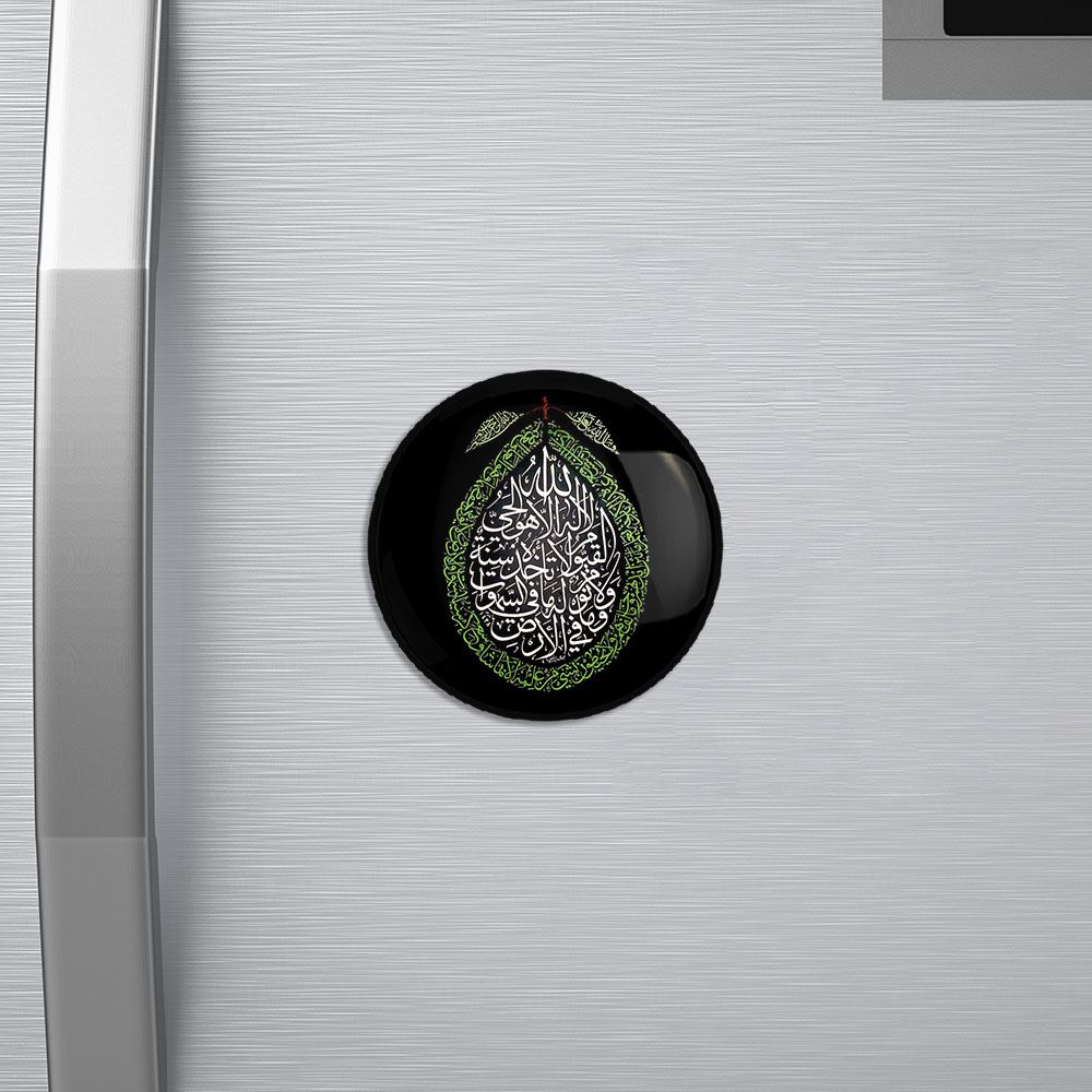 مگنت آیه الکرسی خندالو با روکش سلفون مات مخملی ضدخش و قطعه پشتی فلزی تولید شده است که آهنربای اتمی بکار برده شده در محصول، بصورت مخفی تعبیه شده ودیده نمی شود. ضمن اینکه گیرایی بسیار بالایی داشته و به هیچ عنوان از روی یخچال نمی افتد.
