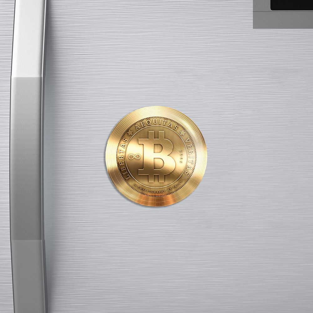 مگنت ارز دیجیتال بیت کوین خندالو با روکش سلفون مات مخملی ضدخش و قطعه پشتی فلزی تولید شده است که آهنربای اتمی بکار برده شده در محصول، بصورت مخفی تعبیه شده ودیده نمی شود. ضمن اینکه گیرایی بسیار بالایی داشته و به هیچ عنوان از روی یخچال نمی افتد.