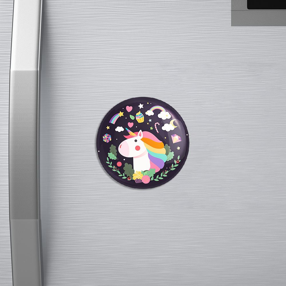 مگنت اسب تک شاخ یونیکورن خندالو با روکش سلفون مات مخملی ضدخش و قطعه پشتی فلزی تولید شده است که آهنربای اتمی بکار برده شده در محصول، بصورت مخفی تعبیه شده ودیده نمی شود. ضمن اینکه گیرایی بسیار بالایی داشته و به هیچ عنوان از روی یخچال نمی افتد.
