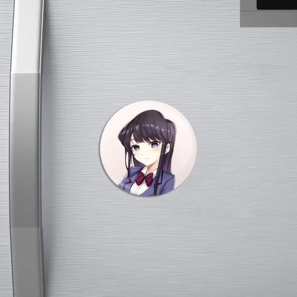 مگنت انیمه کومی سان خندالو با روکش سلفون مات مخملی ضدخش و قطعه پشتی فلزی تولید شده است که آهنربای اتمی بکار برده شده در محصول، بصورت مخفی تعبیه شده ودیده نمی شود. ضمن اینکه گیرایی بسیار بالایی داشته و به هیچ عنوان از روی یخچال نمی افتد.