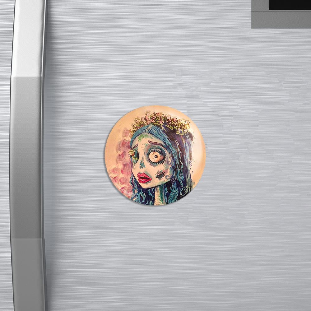 مگنت انیمیشن عروس مردگان خندالو با روکش سلفون مات مخملی ضدخش و قطعه پشتی فلزی تولید شده است که آهنربای اتمی بکار برده شده در محصول، بصورت مخفی تعبیه شده ودیده نمی شود. ضمن اینکه گیرایی بسیار بالایی داشته و به هیچ عنوان از روی یخچال نمی افتد.