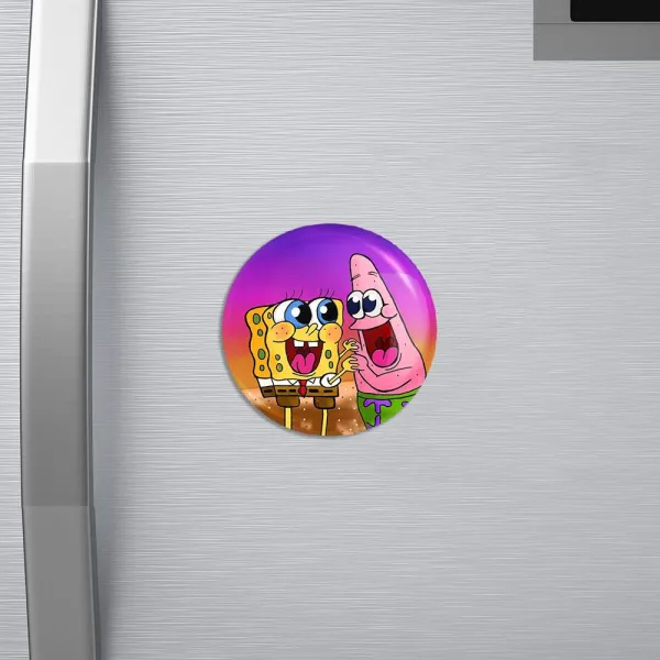 مگنت باب اسفنجی خندالو با روکش سلفون مات مخملی ضدخش و قطعه پشتی فلزی تولید شده است که آهنربای اتمی بکار برده شده در محصول، بصورت مخفی تعبیه شده ودیده نمی شود. ضمن اینکه گیرایی بسیار بالایی داشته و به هیچ عنوان از روی یخچال نمی افتد.