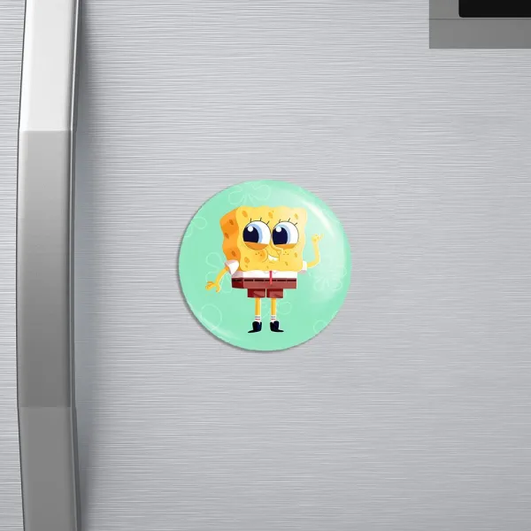 مگنت باب اسفنجی خندالو با روکش سلفون مات مخملی ضدخش و قطعه پشتی فلزی تولید شده است که آهنربای اتمی بکار برده شده در محصول، بصورت مخفی تعبیه شده ودیده نمی شود. ضمن اینکه گیرایی بسیار بالایی داشته و به هیچ عنوان از روی یخچال نمی افتد.