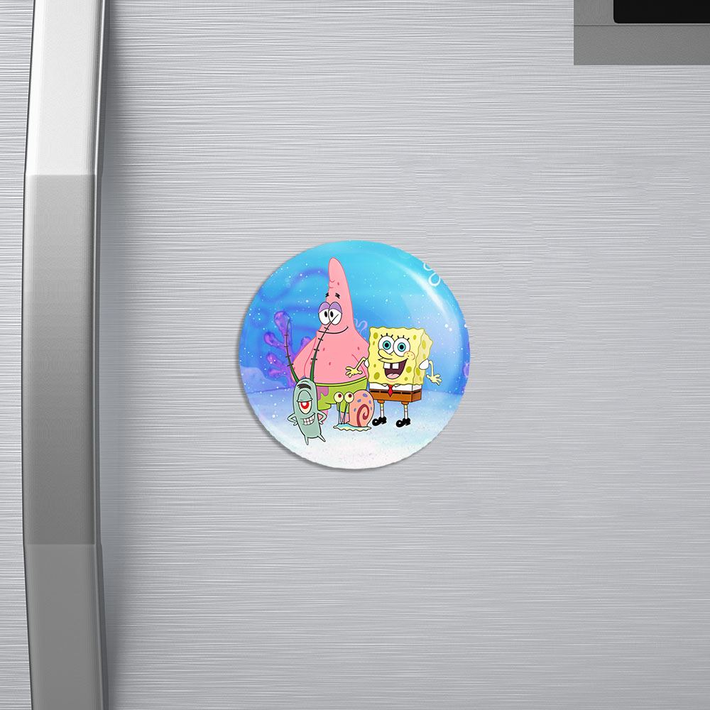 مگنت باب اسفنجی خندالو با روکش سلفون مات مخملی ضدخش و قطعه پشتی فلزی تولید شده است که آهنربای اتمی بکار برده شده در محصول، بصورت مخفی تعبیه شده ودیده نمی شود. ضمن اینکه گیرایی بسیار بالایی داشته و به هیچ عنوان از روی یخچال نمی افتد.