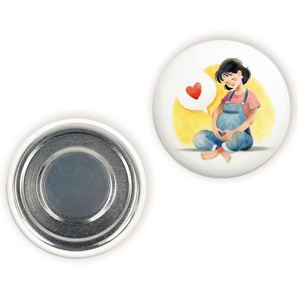 مگنت بارداری خندالو با روکش سلفون مات مخملی ضدخش و قطعه پشتی فلزی تولید شده است که آهنربای اتمی بکار برده شده در محصول، بصورت مخفی تعبیه شده ودیده نمی شود. ضمن اینکه گیرایی بسیار بالایی داشته و به هیچ عنوان از روی یخچال نمی افتد.