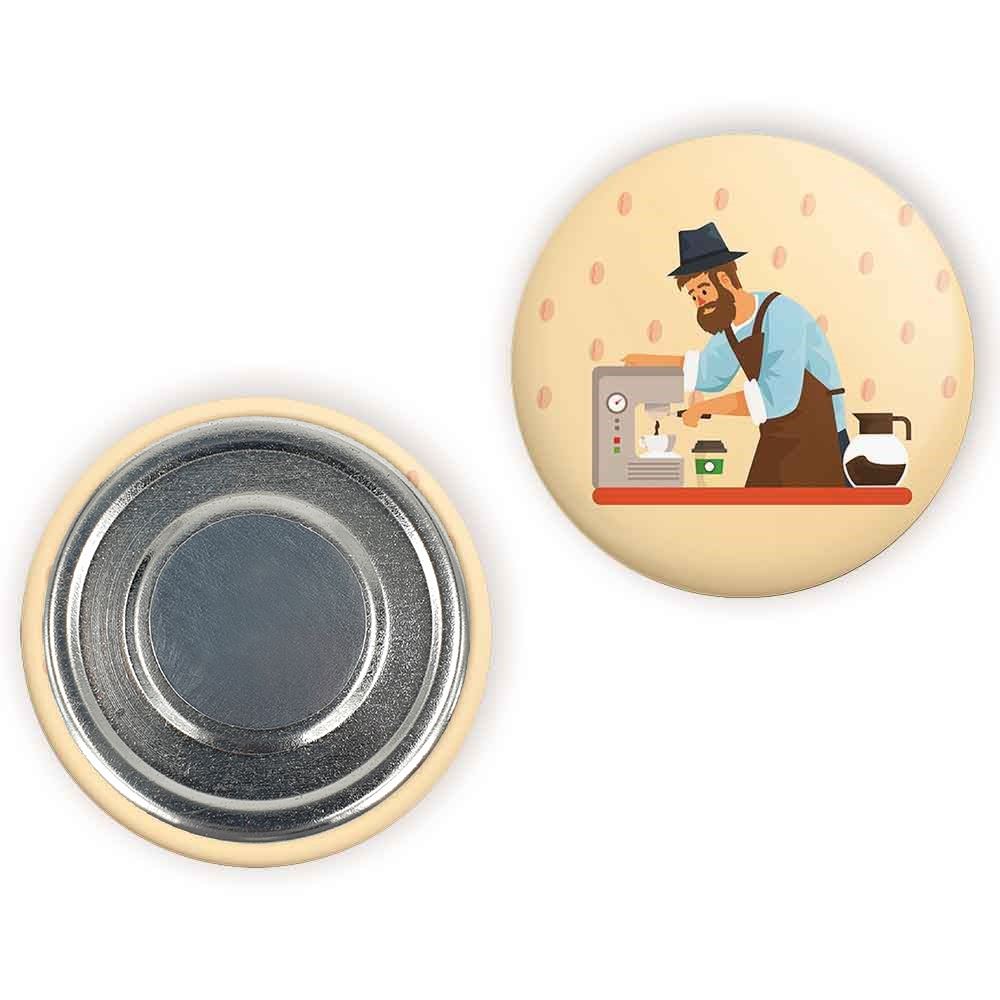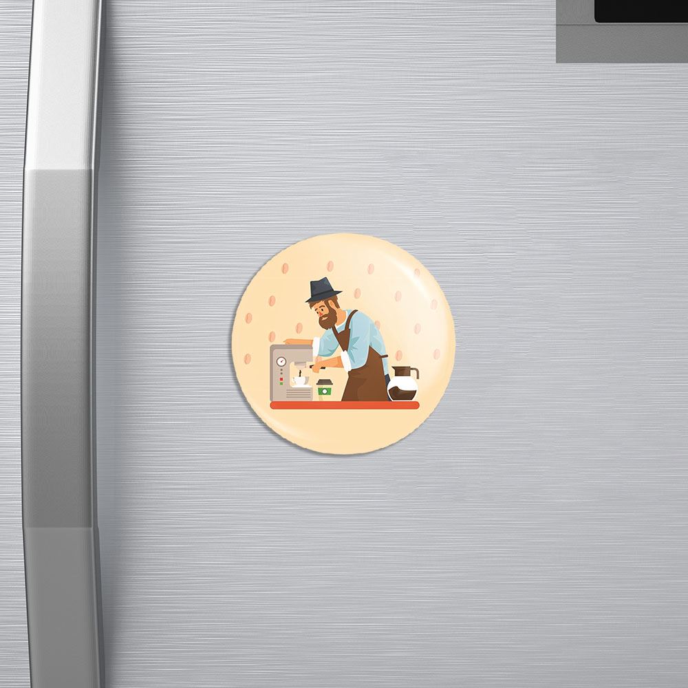 مگنت باریستا کافه چی خندالو با روکش سلفون مات مخملی ضدخش و قطعه پشتی فلزی تولید شده است که آهنربای اتمی بکار برده شده در محصول، بصورت مخفی تعبیه شده ودیده نمی شود. ضمن اینکه گیرایی بسیار بالایی داشته و به هیچ عنوان از روی یخچال نمی افتد.
