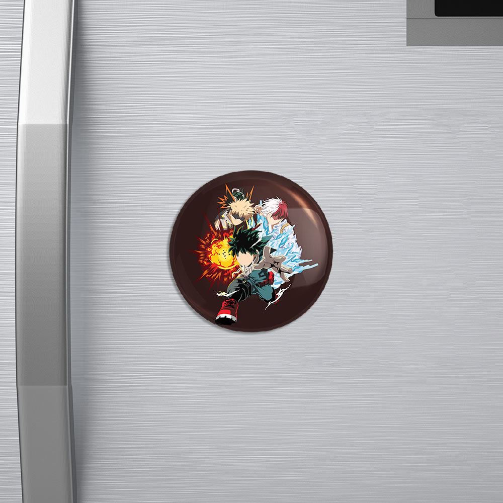 مگنت باکوگو و دکو و شوتو انیمه آکادمی قهرمان من خندالو با روکش سلفون مات مخملی ضدخش و قطعه پشتی فلزی تولید شده است که آهنربای اتمی بکار برده شده در محصول، بصورت مخفی تعبیه شده ودیده نمی شود. ضمن اینکه گیرایی بسیار بالایی داشته و به هیچ عنوان از روی یخچال نمی افتد.