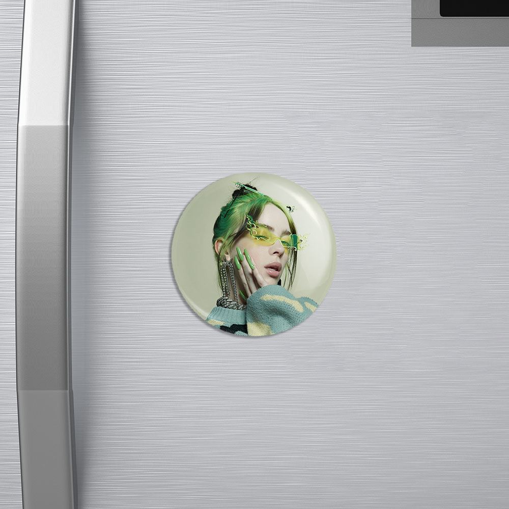 مگنت بیلی آیلیش Billie Eilish خندالو با روکش سلفون مات مخملی ضدخش و قطعه پشتی فلزی تولید شده است که آهنربای اتمی بکار برده شده در محصول، بصورت مخفی تعبیه شده ودیده نمی شود. ضمن اینکه گیرایی بسیار بالایی داشته و به هیچ عنوان از روی یخچال نمی افتد.