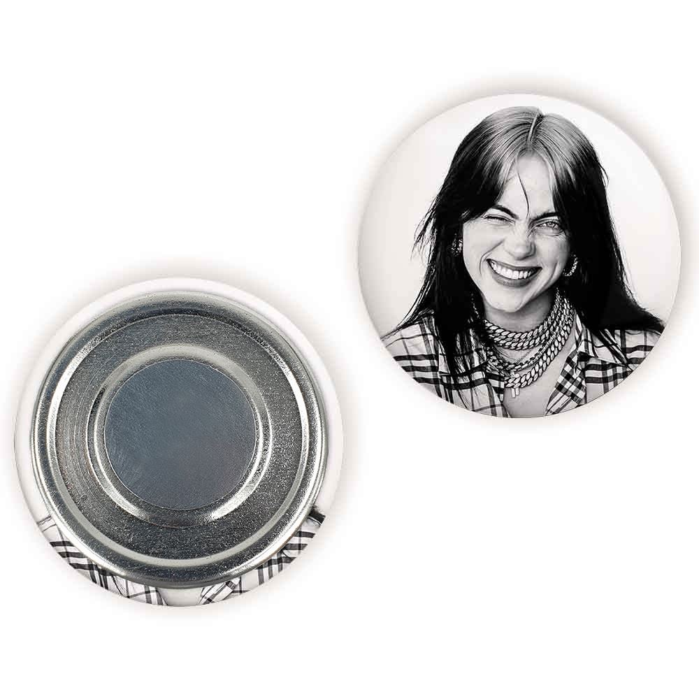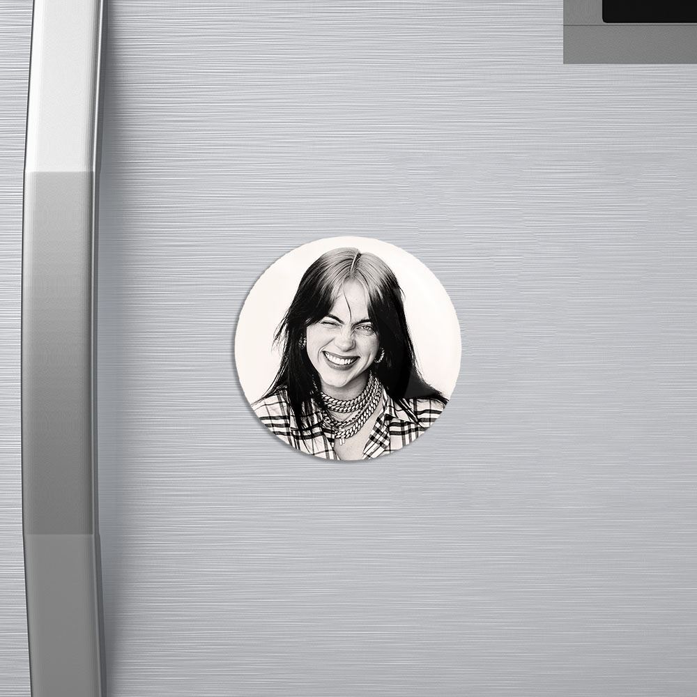 مگنت بیلی آیلیش Billie Eilish خندالو با روکش سلفون مات مخملی ضدخش و قطعه پشتی فلزی تولید شده است که آهنربای اتمی بکار برده شده در محصول، بصورت مخفی تعبیه شده ودیده نمی شود. ضمن اینکه گیرایی بسیار بالایی داشته و به هیچ عنوان از روی یخچال نمی افتد.