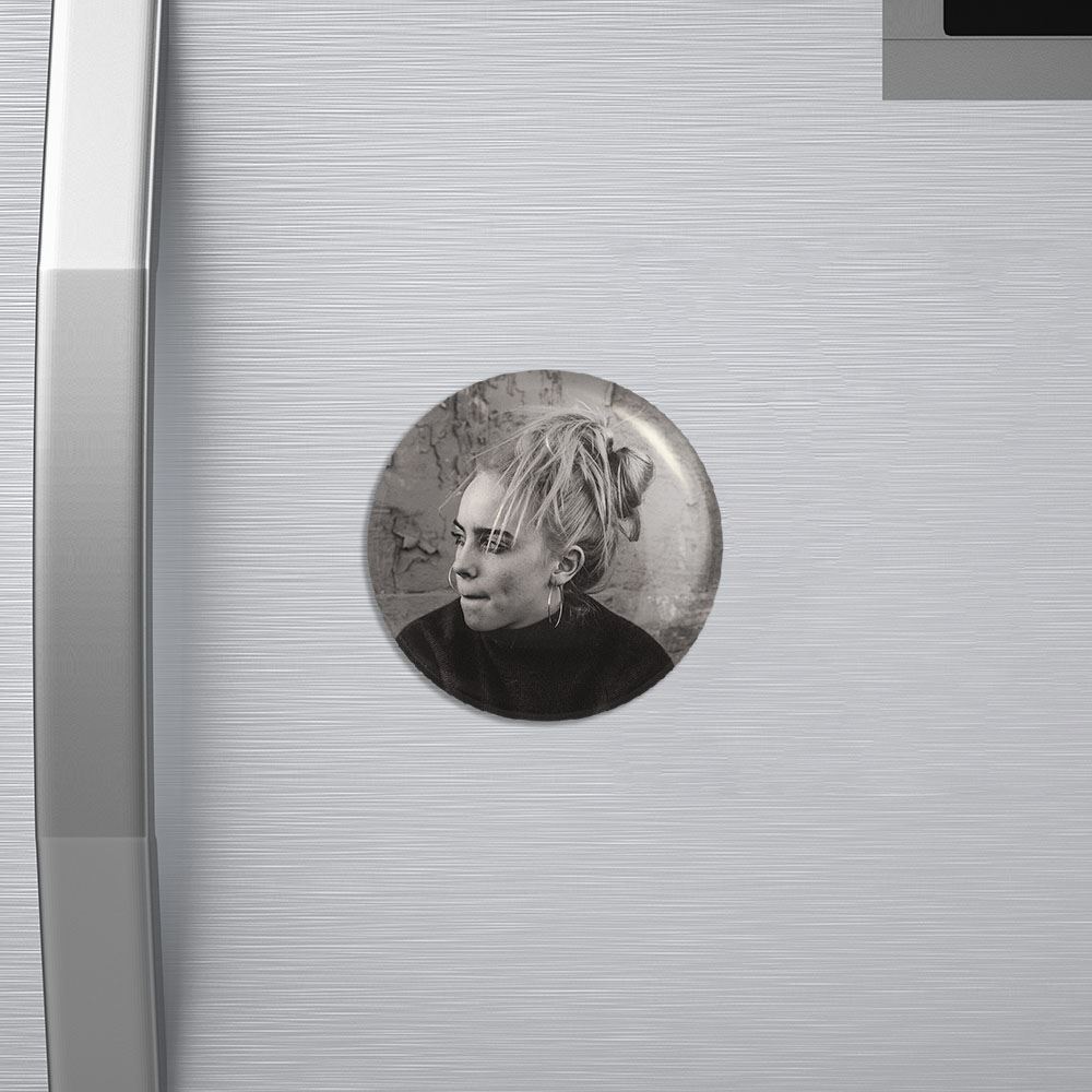 مگنت بیلی آیلیش Billie Eilish خندالو با روکش سلفون مات مخملی ضدخش و قطعه پشتی فلزی تولید شده است که آهنربای اتمی بکار برده شده در محصول، بصورت مخفی تعبیه شده ودیده نمی شود. ضمن اینکه گیرایی بسیار بالایی داشته و به هیچ عنوان از روی یخچال نمی افتد.