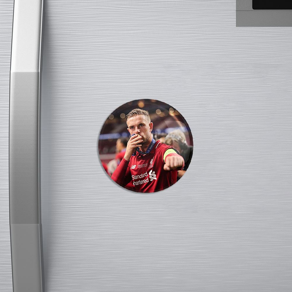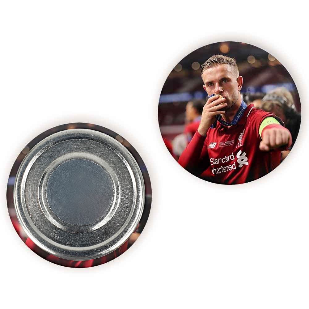 مگنت جردن هندرسون Jordan Henderson خندالو با روکش سلفون مات مخملی ضدخش و قطعه پشتی فلزی تولید شده است که آهنربای اتمی بکار برده شده در محصول، بصورت مخفی تعبیه شده ودیده نمی شود. ضمن اینکه گیرایی بسیار بالایی داشته و به هیچ عنوان از روی یخچال نمی افتد.
