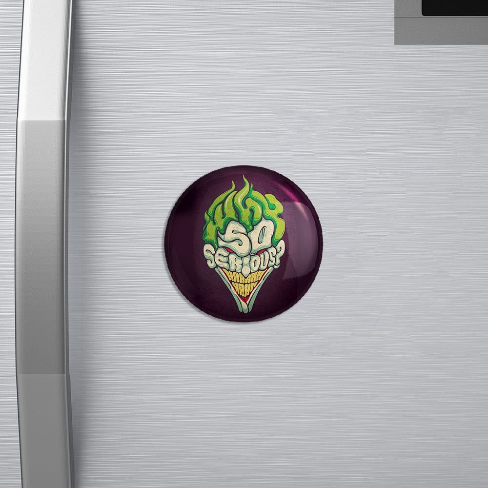 مگنت جوکر Joker خندالو با روکش سلفون مات مخملی ضدخش و قطعه پشتی فلزی تولید شده است که آهنربای اتمی بکار برده شده در محصول، بصورت مخفی تعبیه شده ودیده نمی شود. ضمن اینکه گیرایی بسیار بالایی داشته و به هیچ عنوان از روی یخچال نمی افتد.