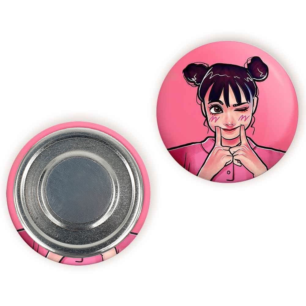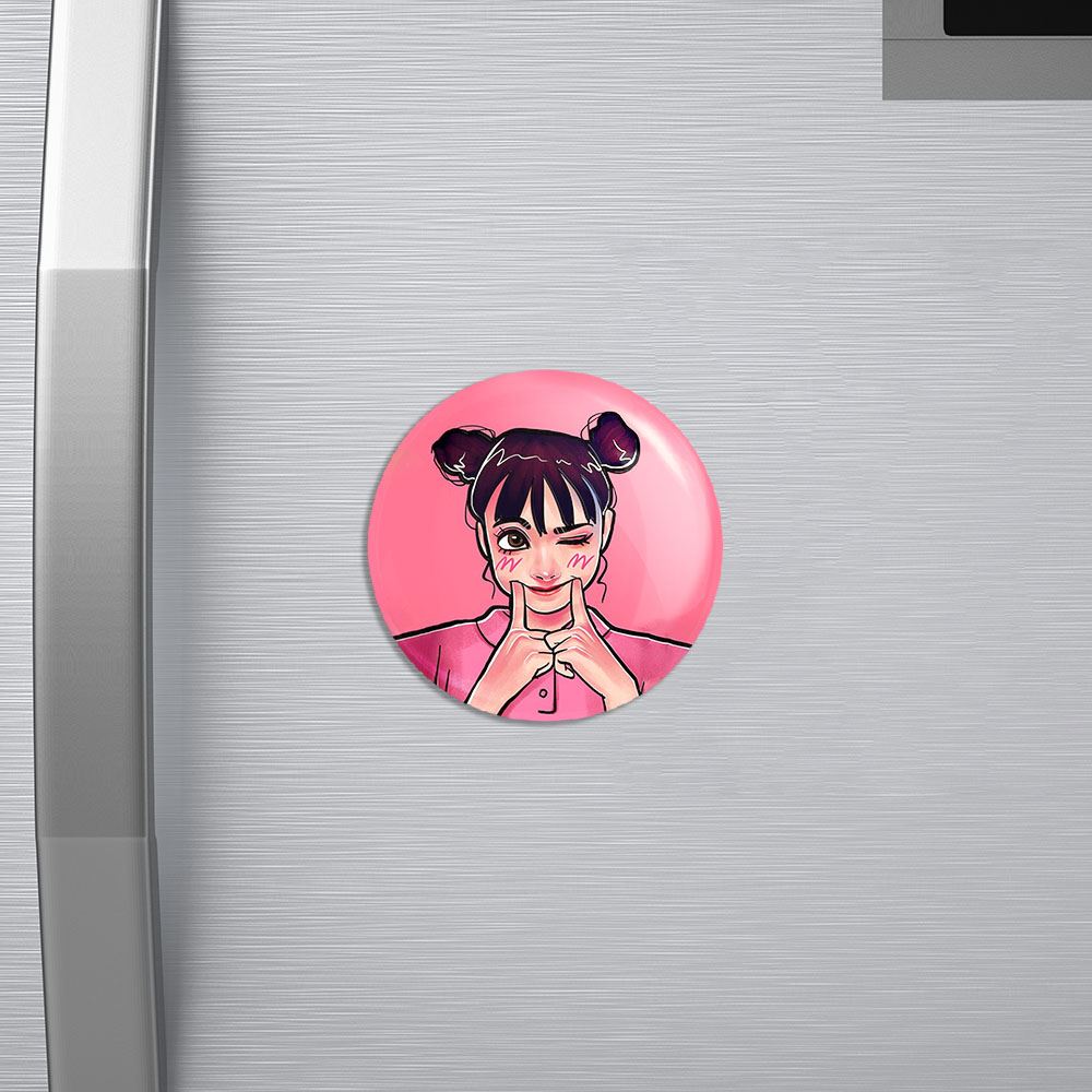 مگنت دخترانه خندالو با روکش سلفون مات مخملی ضدخش و قطعه پشتی فلزی تولید شده است که آهنربای اتمی بکار برده شده در محصول، بصورت مخفی تعبیه شده ودیده نمی شود. ضمن اینکه گیرایی بسیار بالایی داشته و به هیچ عنوان از روی یخچال نمی افتد.
