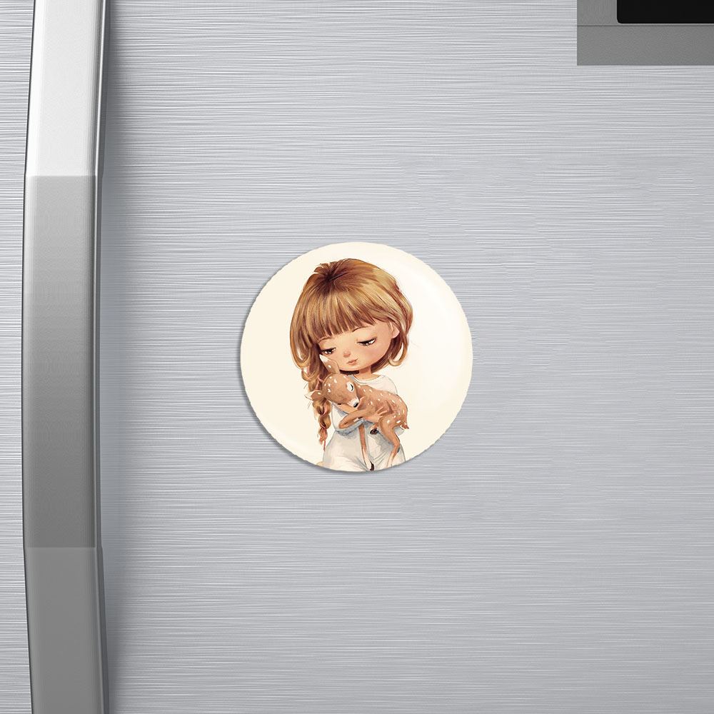 مگنت دخترونه خندالو با روکش سلفون مات مخملی ضدخش و قطعه پشتی فلزی تولید شده است که آهنربای اتمی بکار برده شده در محصول، بصورت مخفی تعبیه شده ودیده نمی شود. ضمن اینکه گیرایی بسیار بالایی داشته و به هیچ عنوان از روی یخچال نمی افتد.