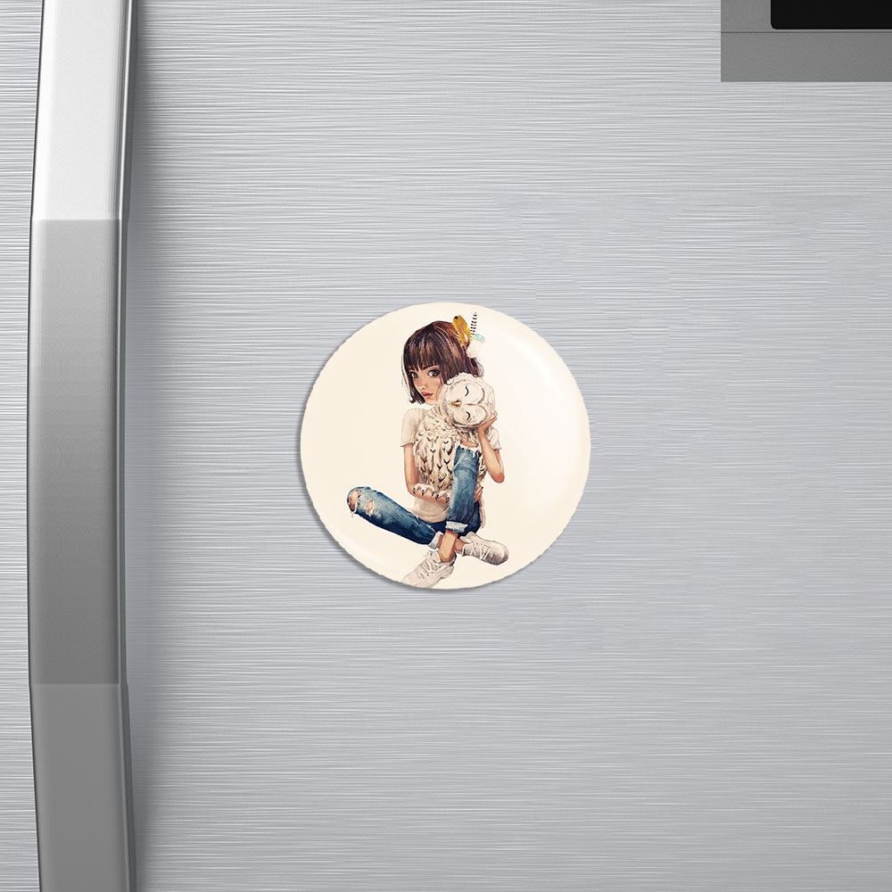 مگنت دخترونه خندالو با روکش سلفون مات مخملی ضدخش و قطعه پشتی فلزی تولید شده است که آهنربای اتمی بکار برده شده در محصول، بصورت مخفی تعبیه شده ودیده نمی شود. ضمن اینکه گیرایی بسیار بالایی داشته و به هیچ عنوان از روی یخچال نمی افتد.