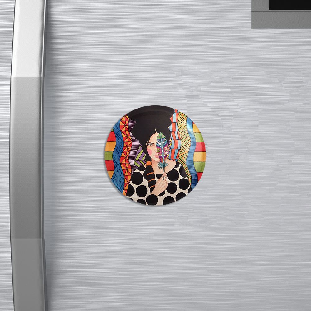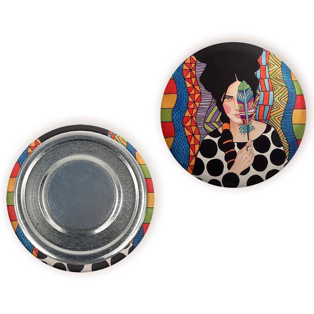 مگنت دخترونه خندالو با روکش سلفون مات مخملی ضدخش و قطعه پشتی فلزی تولید شده است که آهنربای اتمی بکار برده شده در محصول، بصورت مخفی تعبیه شده ودیده نمی شود. ضمن اینکه گیرایی بسیار بالایی داشته و به هیچ عنوان از روی یخچال نمی افتد.