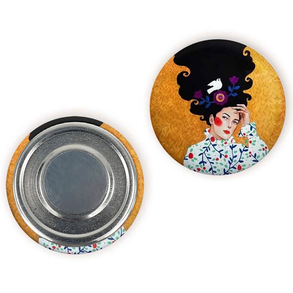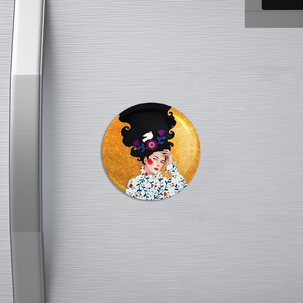 مگنت دخترونه خندالو با روکش سلفون مات مخملی ضدخش و قطعه پشتی فلزی تولید شده است که آهنربای اتمی بکار برده شده در محصول، بصورت مخفی تعبیه شده ودیده نمی شود. ضمن اینکه گیرایی بسیار بالایی داشته و به هیچ عنوان از روی یخچال نمی افتد.