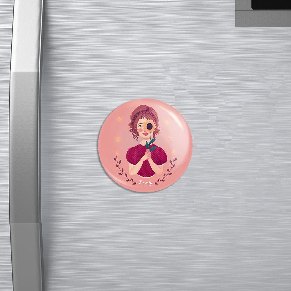مگنت دخترونه خندالو با روکش سلفون مات مخملی ضدخش و قطعه پشتی فلزی تولید شده است که آهنربای اتمی بکار برده شده در محصول، بصورت مخفی تعبیه شده ودیده نمی شود. ضمن اینکه گیرایی بسیار بالایی داشته و به هیچ عنوان از روی یخچال نمی افتد.
