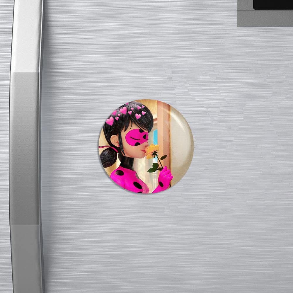 مگنت دختر کفشدوزکی خندالو با روکش سلفون مات مخملی ضدخش و قطعه پشتی فلزی تولید شده است که آهنربای اتمی بکار برده شده در محصول، بصورت مخفی تعبیه شده ودیده نمی شود. ضمن اینکه گیرایی بسیار بالایی داشته و به هیچ عنوان از روی یخچال نمی افتد.
