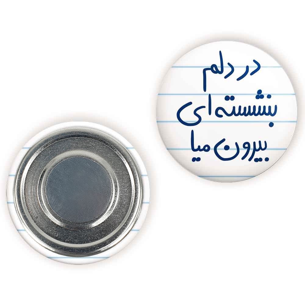 مگنت در دلم بنشسته ای بیرون میا خندالو با روکش سلفون مات مخملی ضدخش و قطعه پشتی فلزی تولید شده است که آهنربای اتمی بکار برده شده در محصول، بصورت مخفی تعبیه شده ودیده نمی شود. ضمن اینکه گیرایی بسیار بالایی داشته و به هیچ عنوان از روی یخچال نمی افتد.