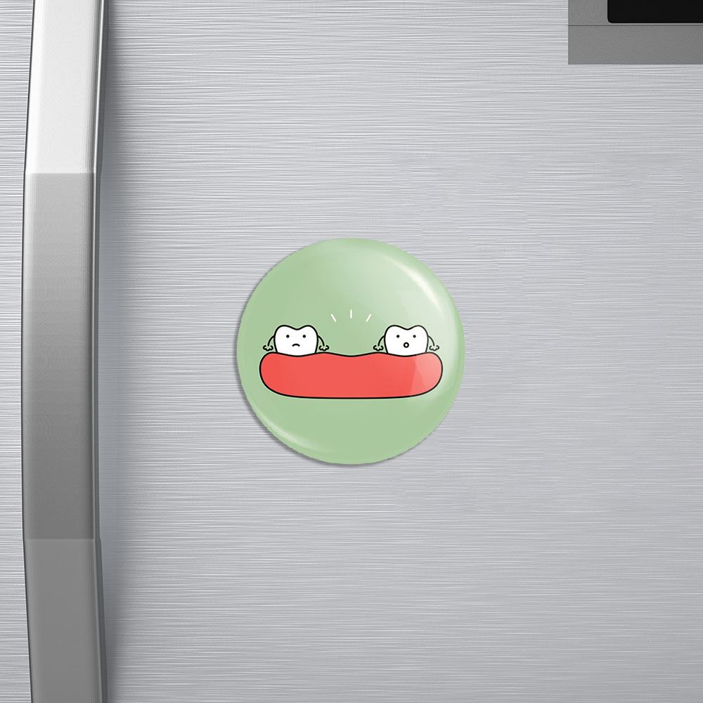 مگنت دندان و دندانپزشکی کودکانه خندالو با روکش سلفون مات مخملی ضدخش و قطعه پشتی فلزی تولید شده است که آهنربای اتمی بکار برده شده در محصول، بصورت مخفی تعبیه شده ودیده نمی شود. ضمن اینکه گیرایی بسیار بالایی داشته و به هیچ عنوان از روی یخچال نمی افتد.