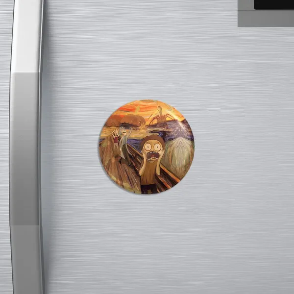 مگنت ریک و مورتی Rick and Morty خندالو با روکش سلفون مات مخملی ضدخش و قطعه پشتی فلزی تولید شده است که آهنربای اتمی بکار برده شده در محصول، بصورت مخفی تعبیه شده ودیده نمی شود. ضمن اینکه گیرایی بسیار بالایی داشته و به هیچ عنوان از روی یخچال نمی افتد.
