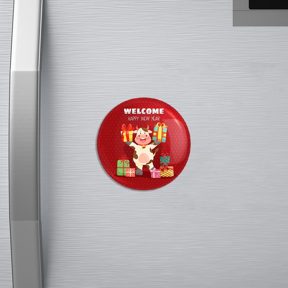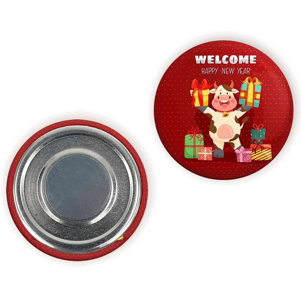 مگنت سال گاو خندالو با روکش سلفون مات مخملی ضدخش و قطعه پشتی فلزی تولید شده است که آهنربای اتمی بکار برده شده در محصول، بصورت مخفی تعبیه شده ودیده نمی شود. ضمن اینکه گیرایی بسیار بالایی داشته و به هیچ عنوان از روی یخچال نمی افتد.