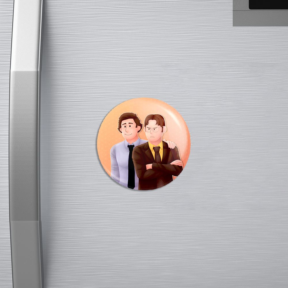 مگنت سریال آفیس The Office خندالو با روکش سلفون مات مخملی ضدخش و قطعه پشتی فلزی تولید شده است که آهنربای اتمی بکار برده شده در محصول، بصورت مخفی تعبیه شده ودیده نمی شود. ضمن اینکه گیرایی بسیار بالایی داشته و به هیچ عنوان از روی یخچال نمی افتد.
