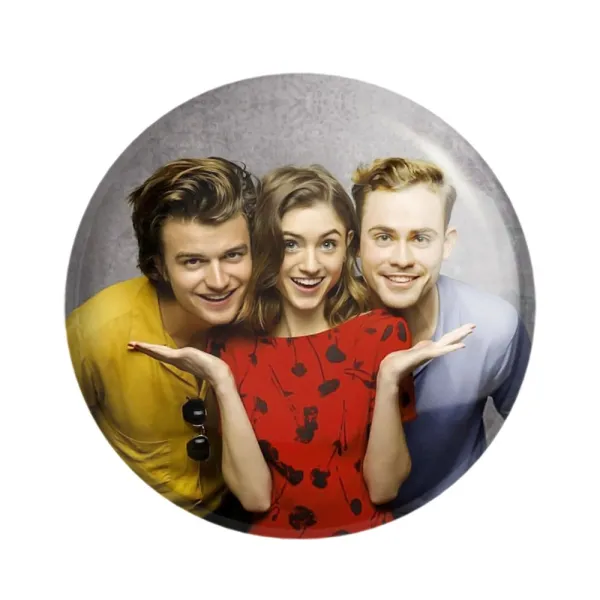 مگنت سریال استرنجر تینگز Stranger Things خندالو با روکش سلفون مات مخملی ضدخش و قطعه پشتی فلزی تولید شده است که آهنربای اتمی بکار برده شده در محصول، بصورت مخفی تعبیه شده ودیده نمی شود. ضمن اینکه گیرایی بسیار بالایی داشته و به هیچ عنوان از روی یخچال نمی افتد.