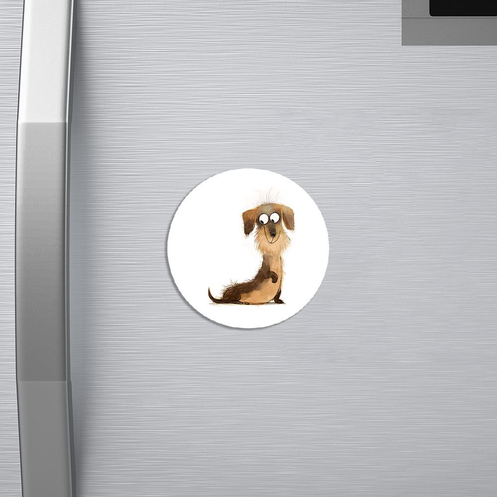 مگنت سگ خندالو با روکش سلفون مات مخملی ضدخش و قطعه پشتی فلزی تولید شده است که آهنربای اتمی بکار برده شده در محصول، بصورت مخفی تعبیه شده ودیده نمی شود. ضمن اینکه گیرایی بسیار بالایی داشته و به هیچ عنوان از روی یخچال نمی افتد.