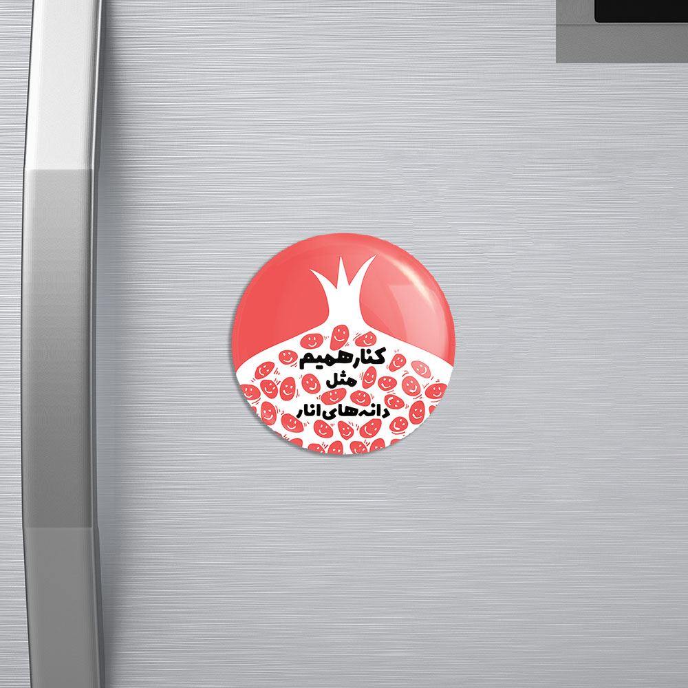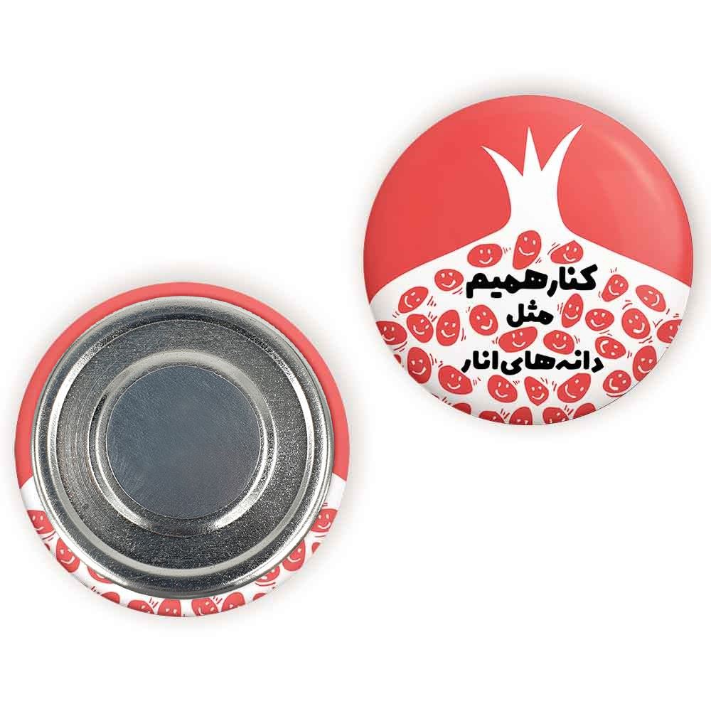 مگنت شب یلدا خندالو با روکش سلفون مات مخملی ضدخش و قطعه پشتی فلزی تولید شده است که آهنربای اتمی بکار برده شده در محصول، بصورت مخفی تعبیه شده ودیده نمی شود. ضمن اینکه گیرایی بسیار بالایی داشته و به هیچ عنوان از روی یخچال نمی افتد.